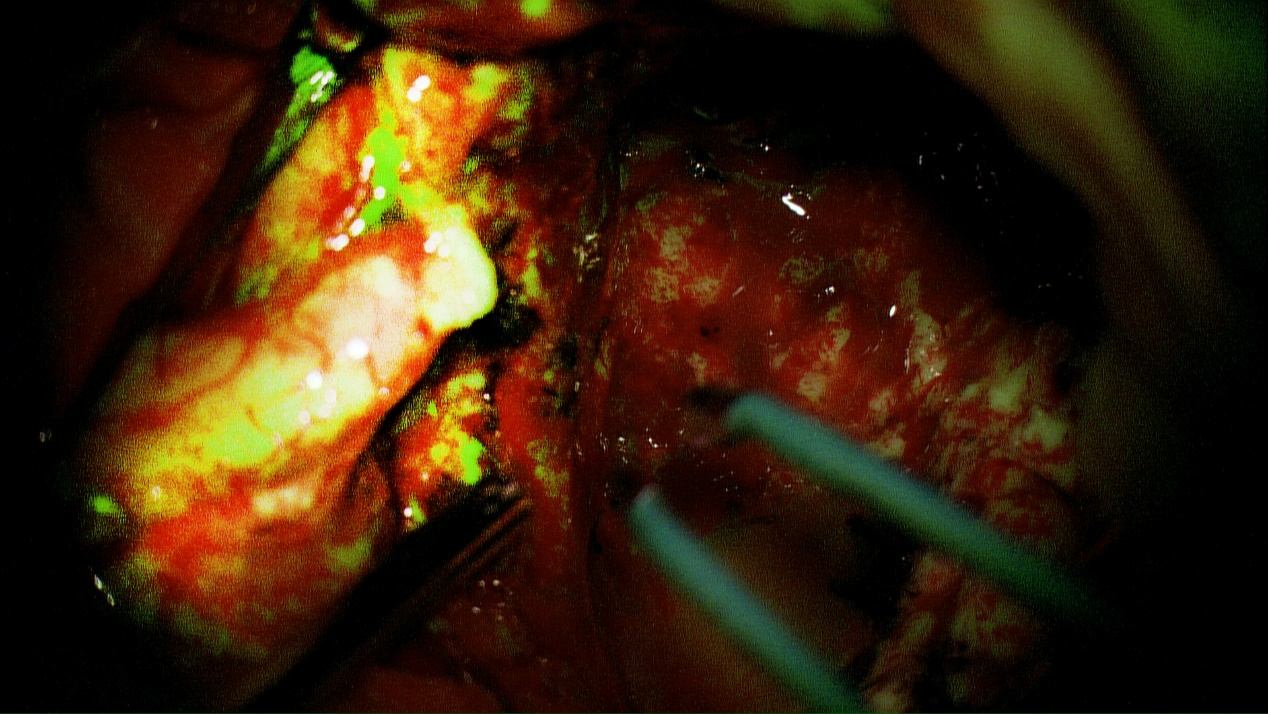 此次自治区南溪山医院神经外科王文波主任团队率先开展桂林市首例黄荧光辅助下脑岛叶肿瘤切除术,通过术前静脉使用黄荧光标记脑肿瘤组织,使术者在显微镜下通过闪烁的黄荧光“引路”,凭借精湛操作技术完美避开正常脑组织为患者精准切除病灶。同时此项技术可以应用于大部分脑肿瘤切除术,做到精确“杀敌”绝不误伤“友军”。