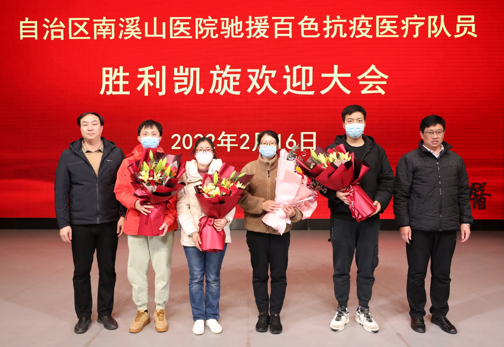 欢迎仪式上,该院党委书记戴前富,党委副书记、院长刘宇军由衷赞誉了队员们为抗击疫情果敢逆行的大义,并对他们在百色“听从指挥,统一行动,团结奋斗”的铁军精神给予了高度评价,称赞他们不仅把白衣天使救死扶伤的使命担当体现得淋漓尽致,更把南溪山医院“厚德精医,大爱担当”的精神风貌从桂北播撒到了桂西大地,希望队员们在今后的工作中继续发挥先锋模范作用,回报在身后默默支持他们的同事和亲友。