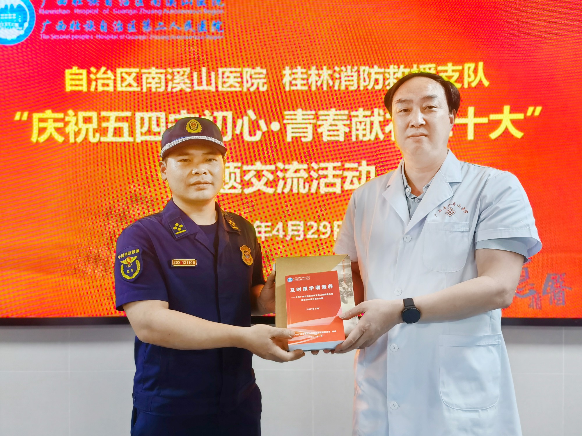 自治区南溪山医院党委副书记、院长刘宇军向桂林市消防救援支队赠送医院党建文化丛书