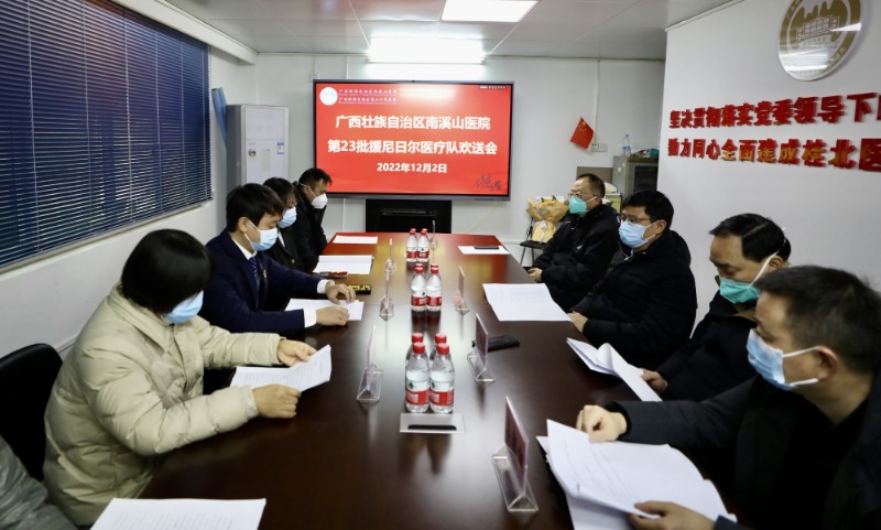 12月2日,广西壮族自治区南溪山医院举行第23批援尼日尔医疗队欢送仪式,为即将奔赴尼日尔开展医疗援外任务的医疗设备管理科工程师梁家骏壮行。该院部分院领导、队员所在科室人员以及相关部门负责人共同出席仪式。