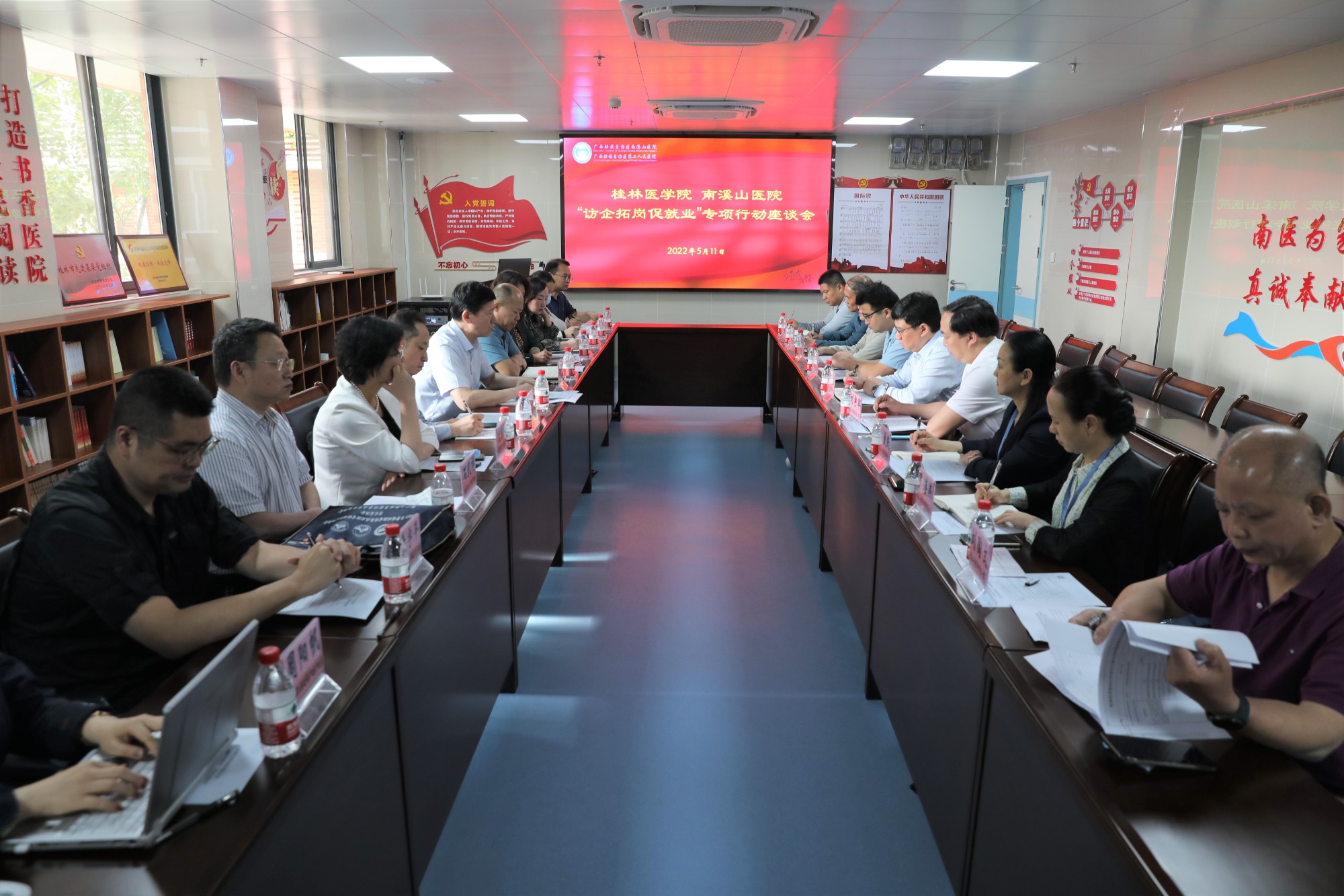 为深化院校高层次人才交流,加强医院人才队伍建设,5月11日,桂林医学院党委书记、校长张志勇带领相关部门人员一行11人到广西壮族自治区南溪山医院进行座谈交流,探讨院校合作。南溪山医院党委书记戴前富,党委副书记、院长刘宇军及相关职能部门负责人出席座谈会。