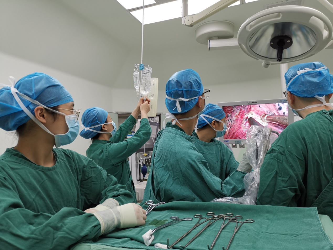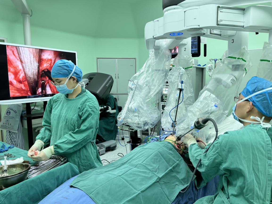 器械护士配合胃肠外科医生进行达芬奇机器人手术