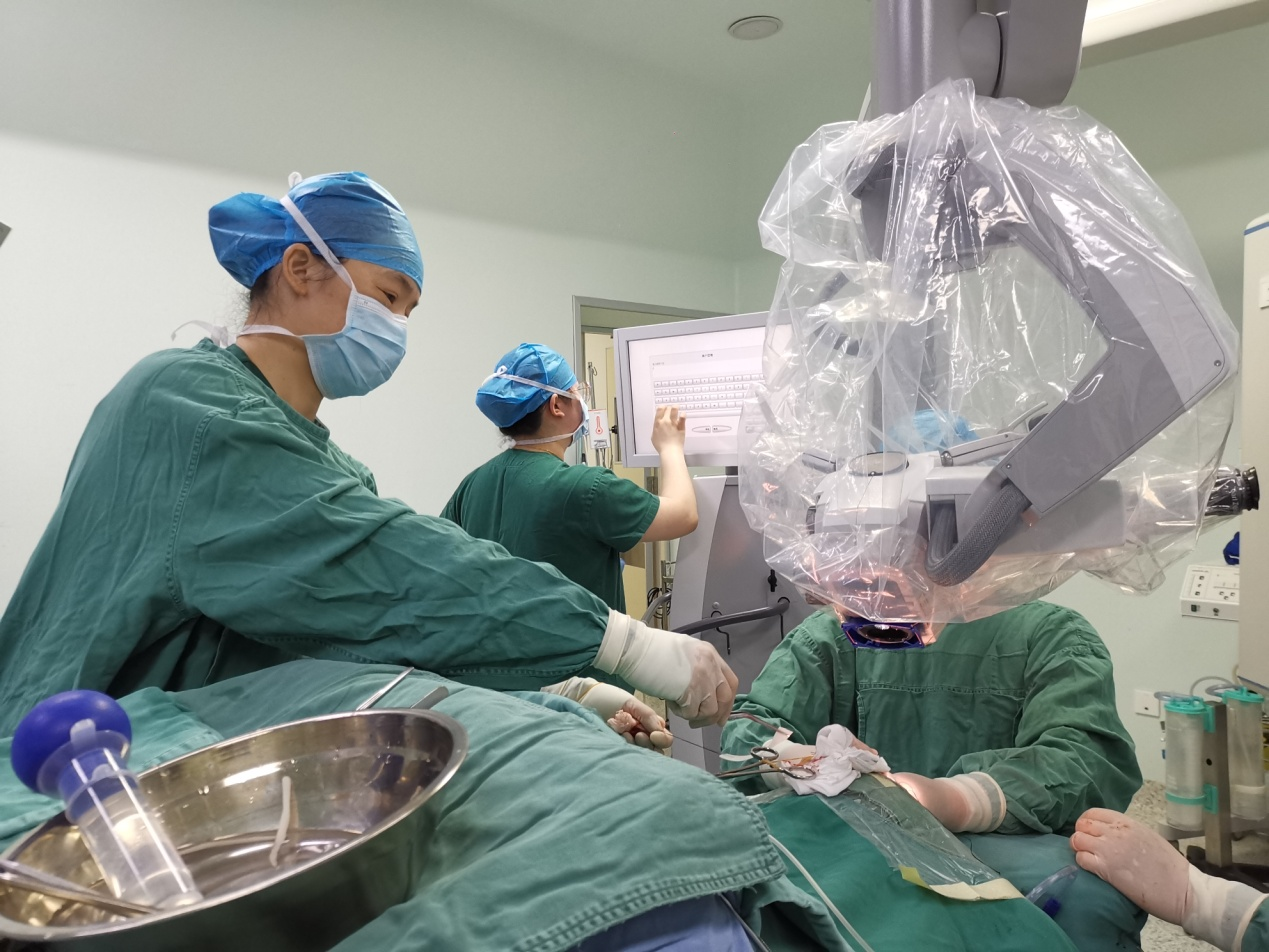 器械护士配合神经外科医生进行荧光显微镜下颅内肿瘤切除术