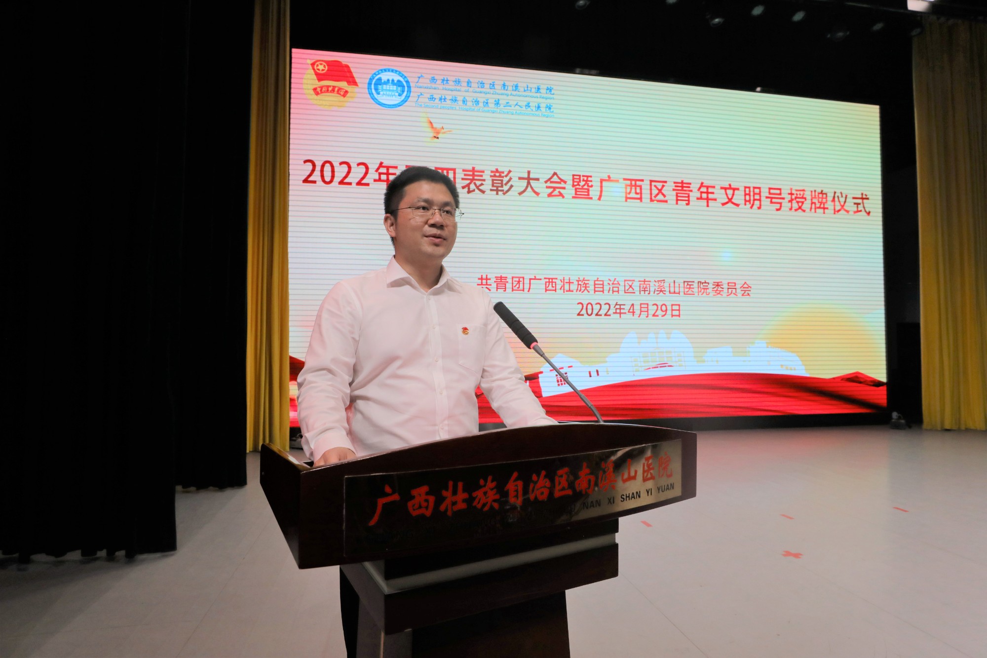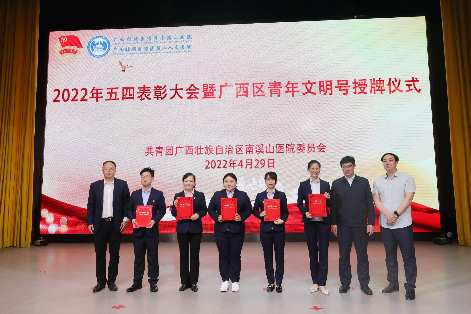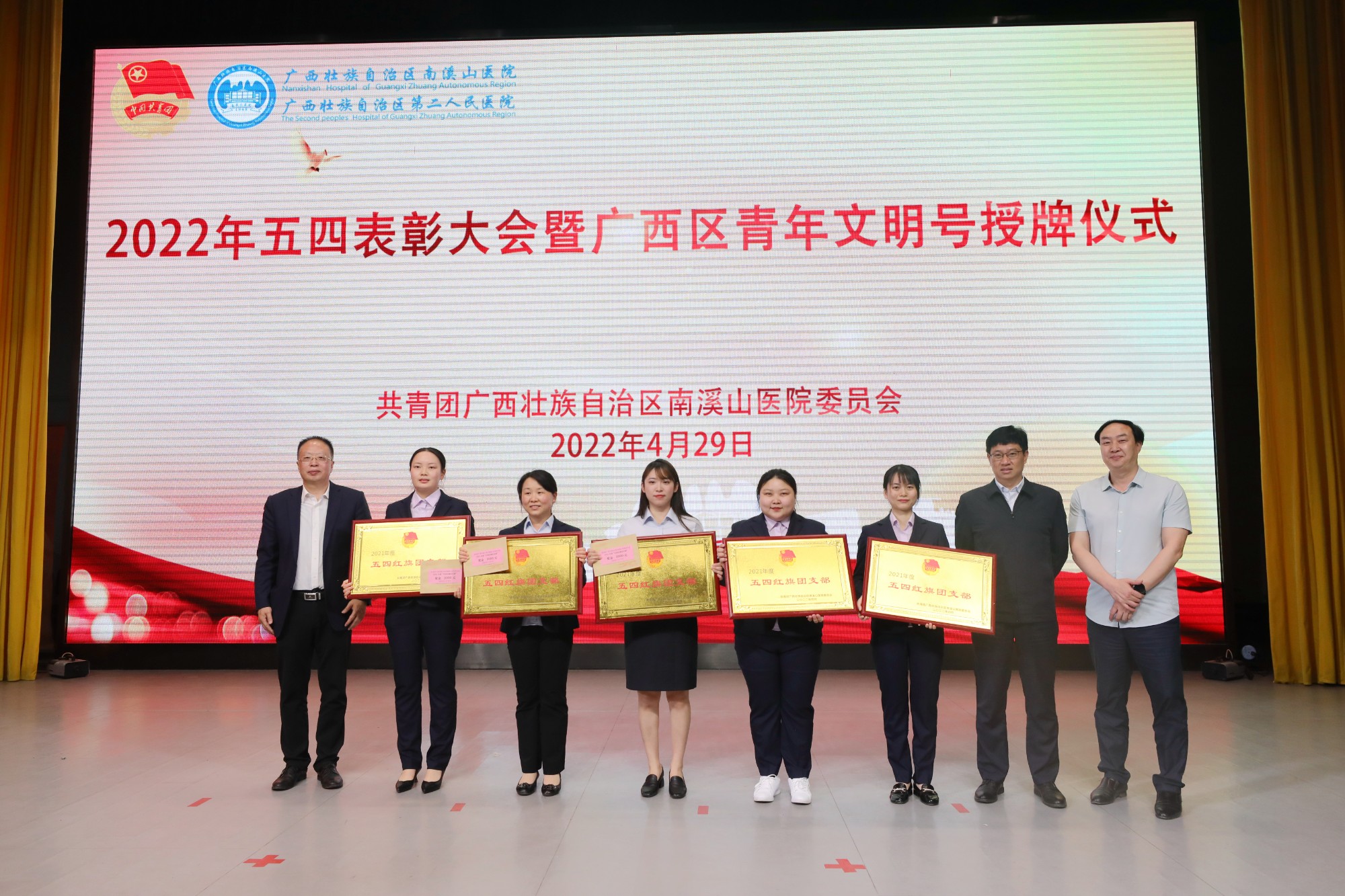 在五四青年节来临之际,4月29日晚,广西壮族自治区南溪山医院在该院大礼堂举办2022年五四表彰大会暨广西区青年文明号授牌仪式,表彰2021年度“五四红旗团支部”、“优秀共青团员”、“优秀共青团干部”,并为荣获2019-2020广西青年文明号的集体授牌。