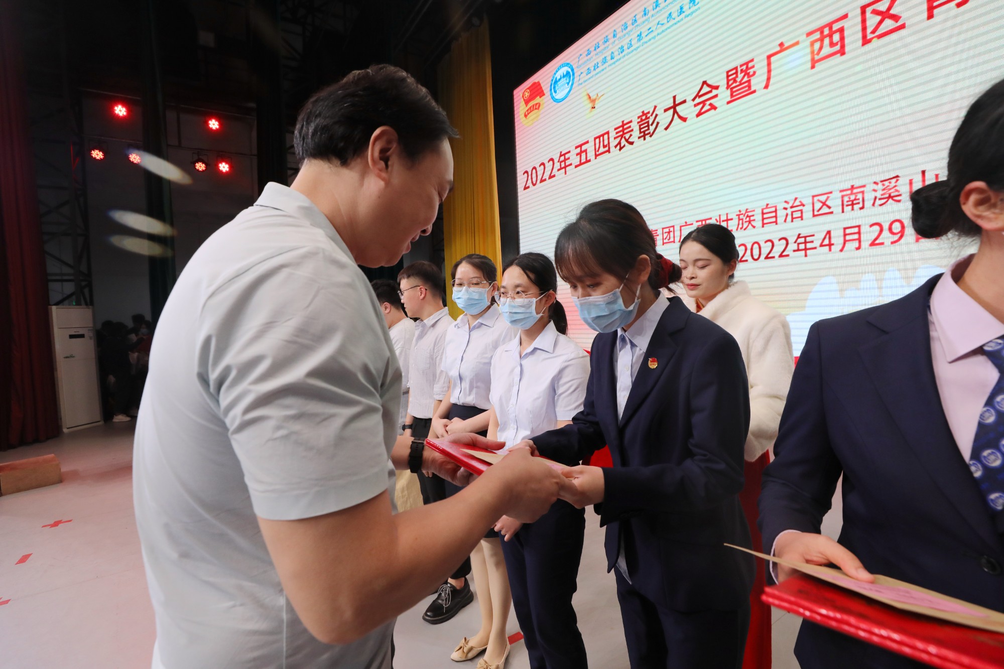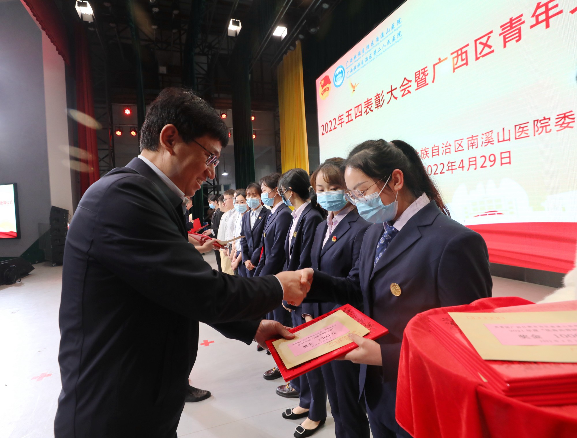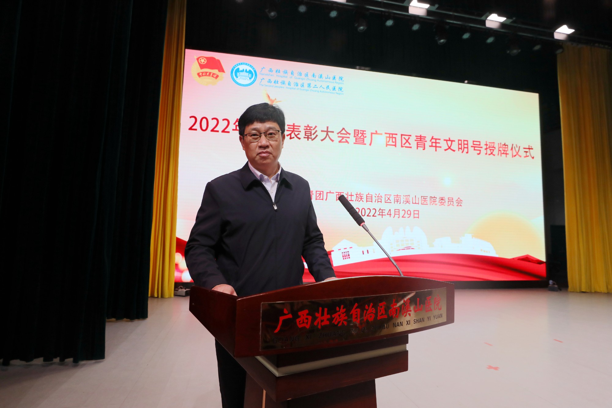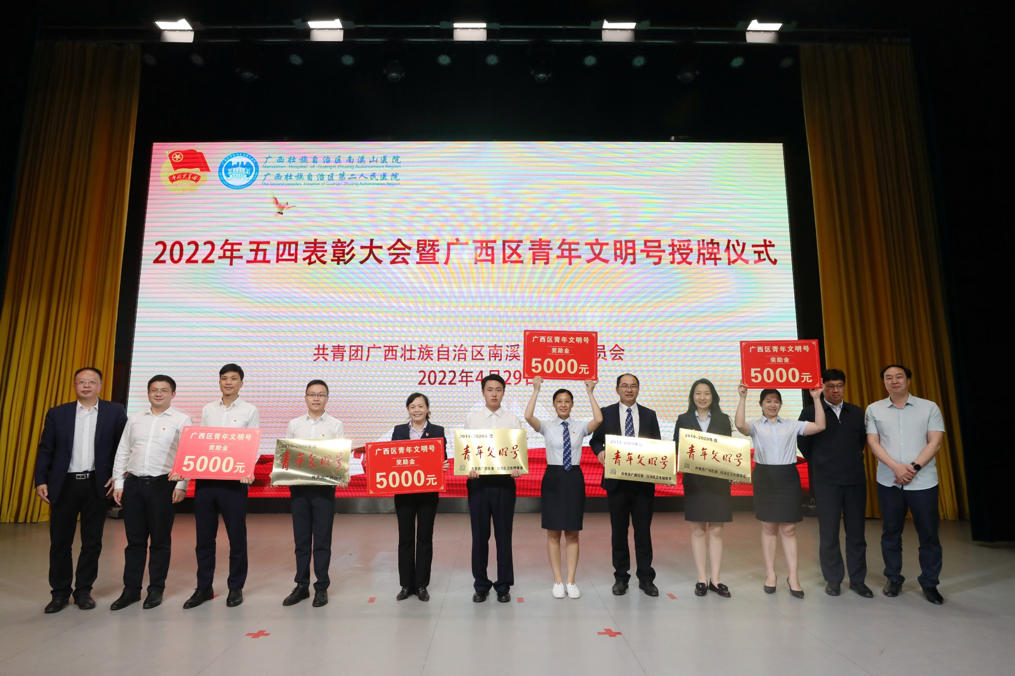 在五四青年节来临之际,4月29日晚,广西壮族自治区南溪山医院在该院大礼堂举办2022年五四表彰大会暨广西区青年文明号授牌仪式,表彰2021年度“五四红旗团支部”、“优秀共青团员”、“优秀共青团干部”,并为荣获2019-2020广西青年文明号的集体授牌。