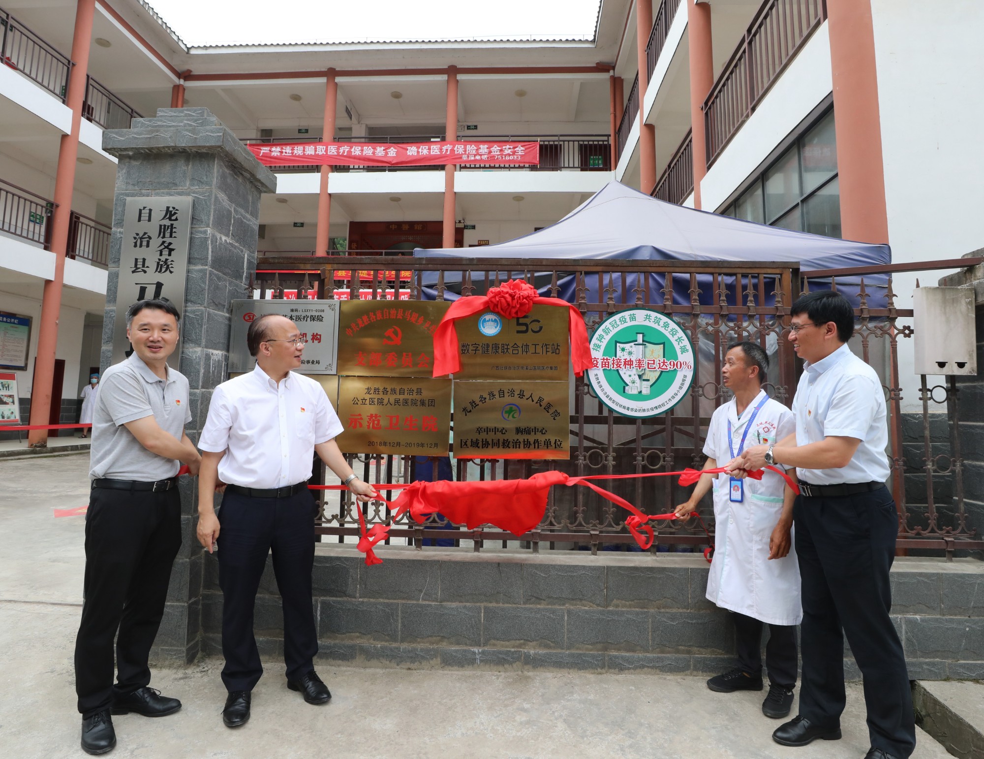 自治区卫生健康委党组书记、主任廖品琥(左二),龙胜县委书记雷陈,自治区南溪山医院党委书记戴前富,马堤乡卫生院院长韦杨高,在马堤乡卫生院共同为自治区南溪山医院医疗集团5G数字健康联合体工作站揭牌