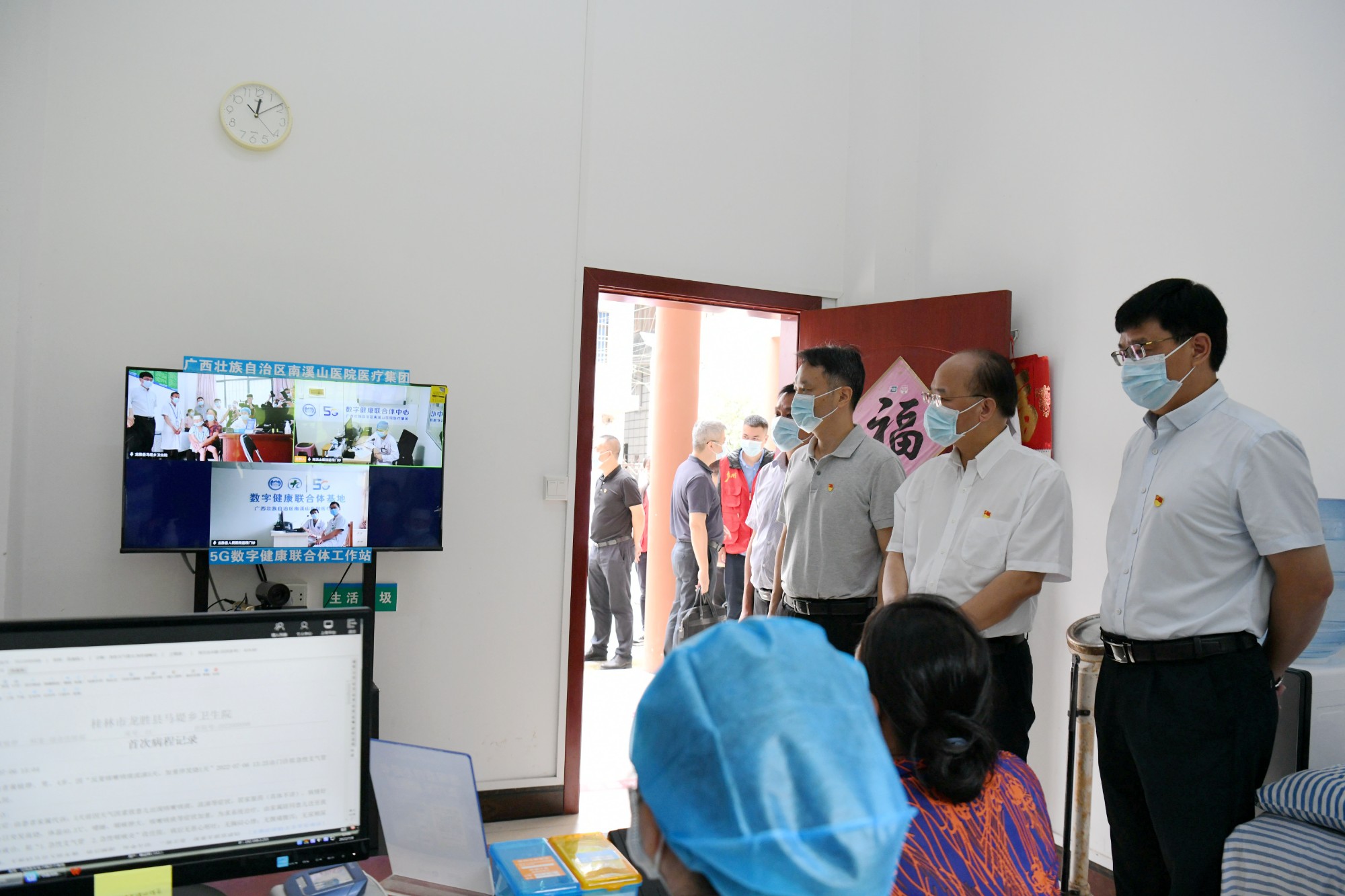 自治区卫生健康委党组书记、主任廖品琥(右二),龙胜县委书记雷陈在马堤乡卫生院调研5G数字健康联合体工作站、乡村振兴医疗保障、基层医疗卫生等工作