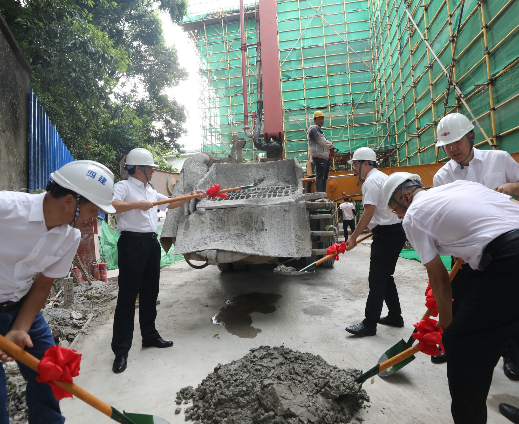 出席仪式的领导共同挥楸铲土,庆祝配套综合楼顺利封顶