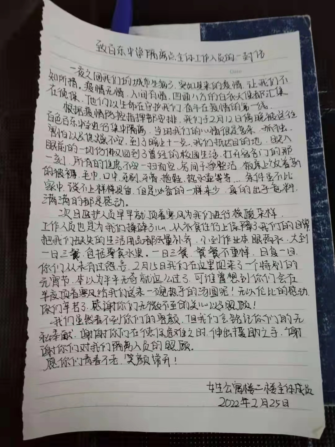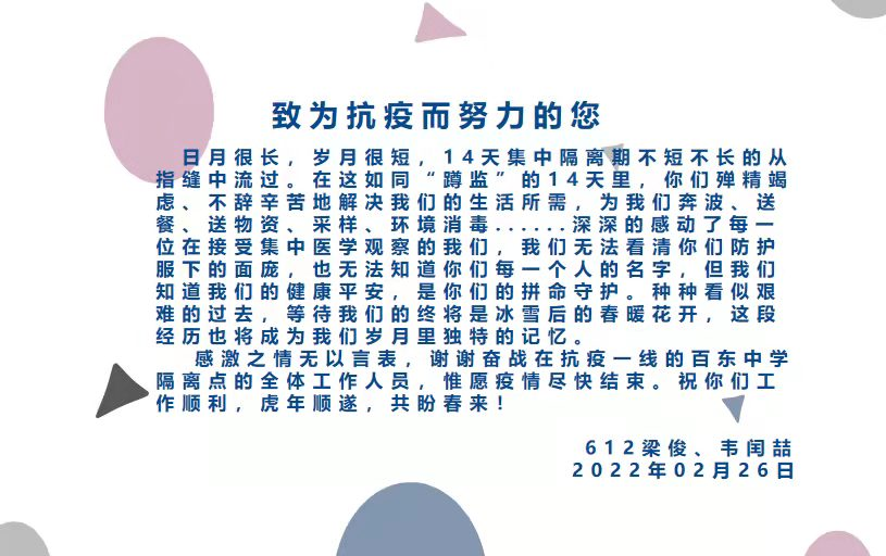 2月15日,隔离者中再检出2例新冠肺炎阳性病例,之后未再检出阳性者。我们也一如平常,继续坚持努力工作,持续监督大家做好防护工作,直至28日,所有的隔离者解除隔离。二十余天,时光飞逝,大家尽心尽力的工作,也赢得了隔离者一致的赞誉及肯定,对我而言,能够真正为大家做点事情,能够得到人民群众的肯定,二十余天的艰苦根本不算什么。