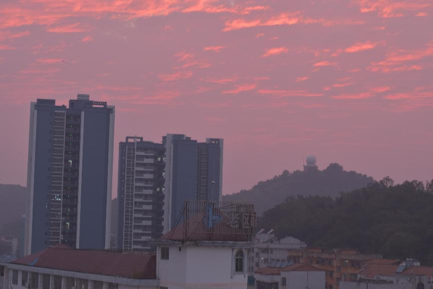 3月1日傍晚,我回到酒店隔离,太阳西下,晚霞满天,我站在窗户前远眺山脊,百色的晚景如梦如幻、让人流连。我回忆着这些天的点点滴滴,所有的酸甜苦辣都涌进脑中,不禁感叹:“山形如贝屋似珍,晚霞绚丽映满天,神兵小将援百色,驱走新冠尽开颜!”