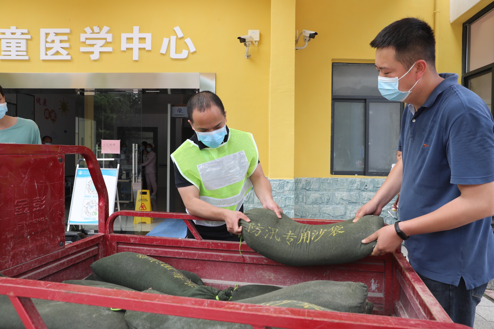搬运沙袋,搭建防洪堤 李金戈摄
