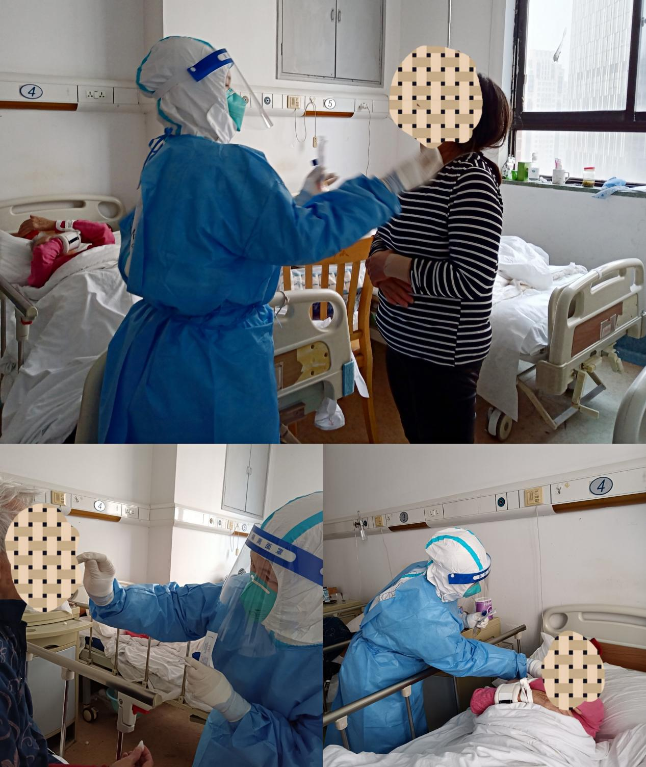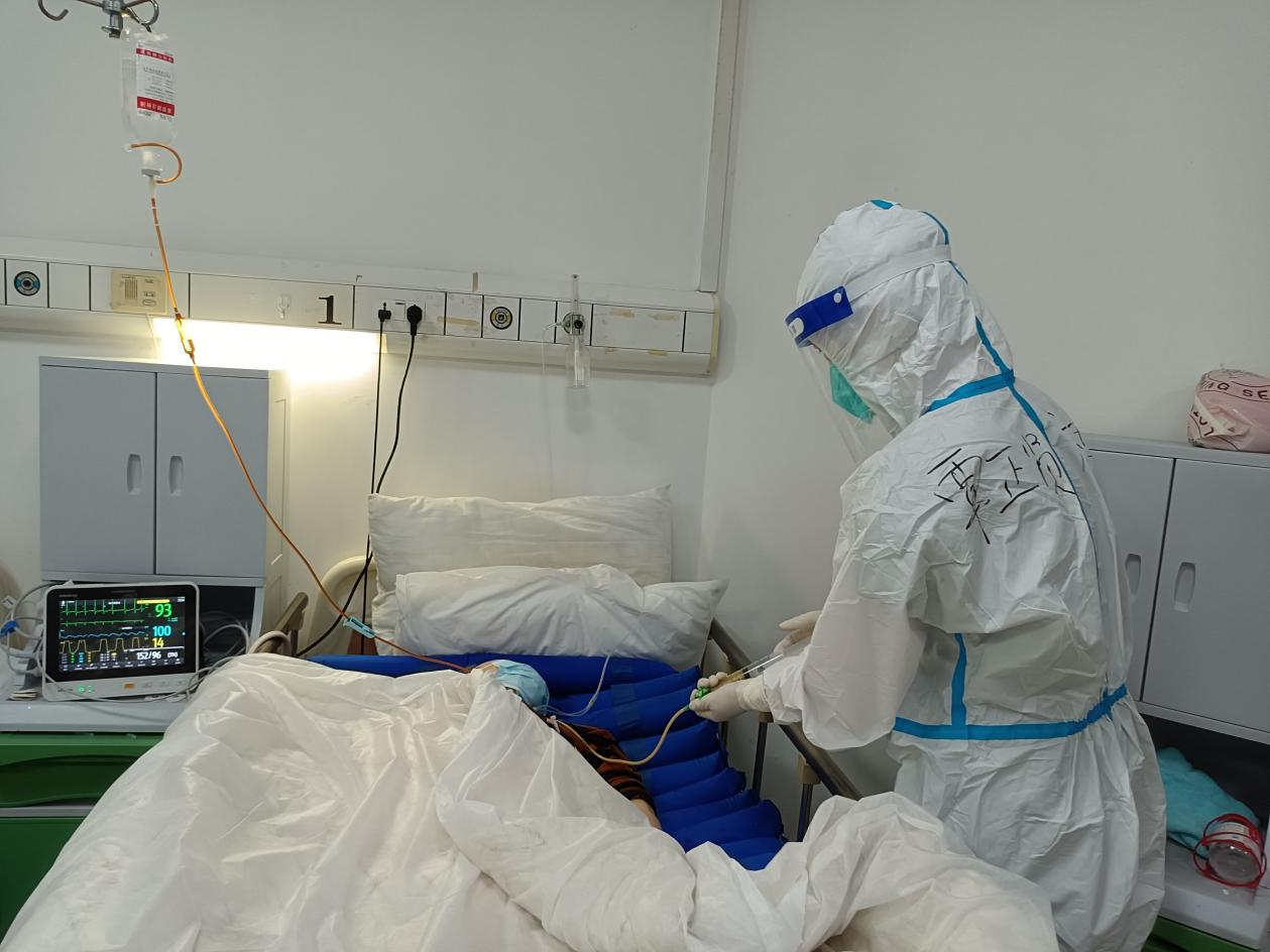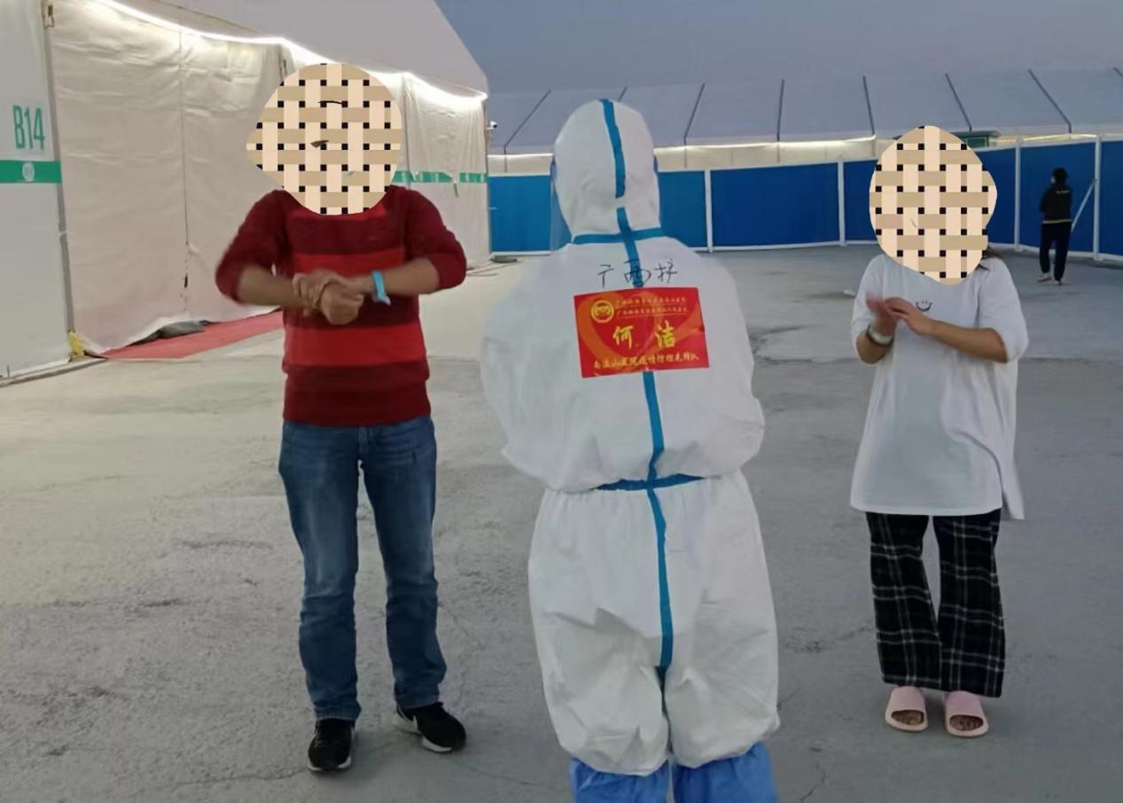 临港二号方舱定点医院主要收治的是无症状感染者,距离住宿地点较远,他们每天去工作需提前两小时出发。在隔离区除了做好日常的护理工作如观察患者病情、用药、测量体温、核酸采样、心理疏导等工作外,为了减少非专业人员到隔离区受感染的风险,还负责隔离区患者的日常起居如送饭、送物资、环境消杀和保洁等一系列工作。在五月的上海,天气逐渐变得越来越热,穿上密不透风的防护服、戴上口罩和面屏,只要稍微活动一下就已经开始出汗,整个面屏都是雾蒙蒙的,此刻平时看来简单的临床护理工作,这时显得有些困难。但是他们克服困难,互相鼓劲,换来的是一批又一批患者的出院。“谢谢你们,上海谢谢你们,你们辛苦了!”每当听到患者这些真心诚意的感谢时,他们眼里泛光,此刻所有的困难都显得微不足道,疲惫顿时烟消云散。