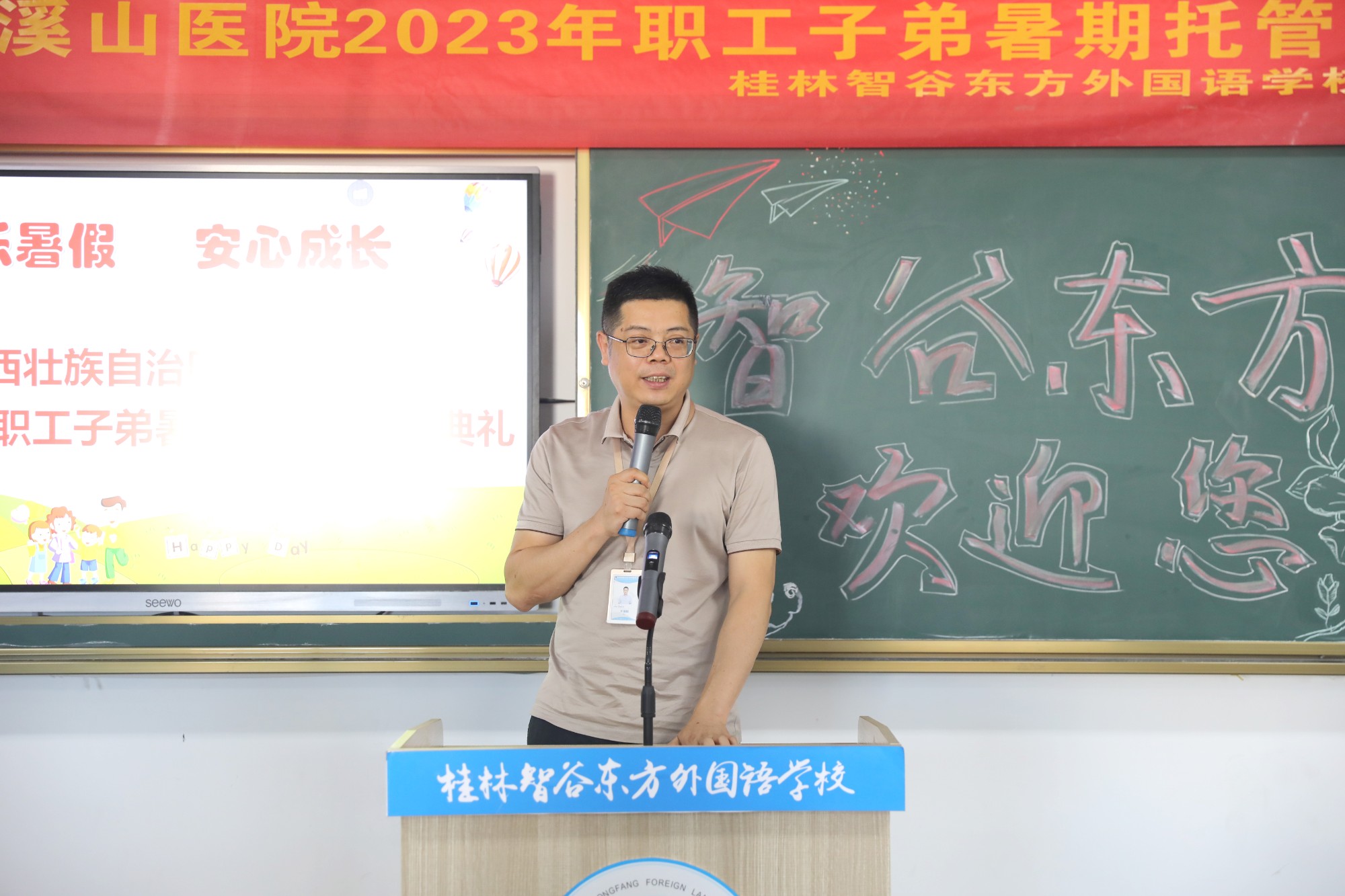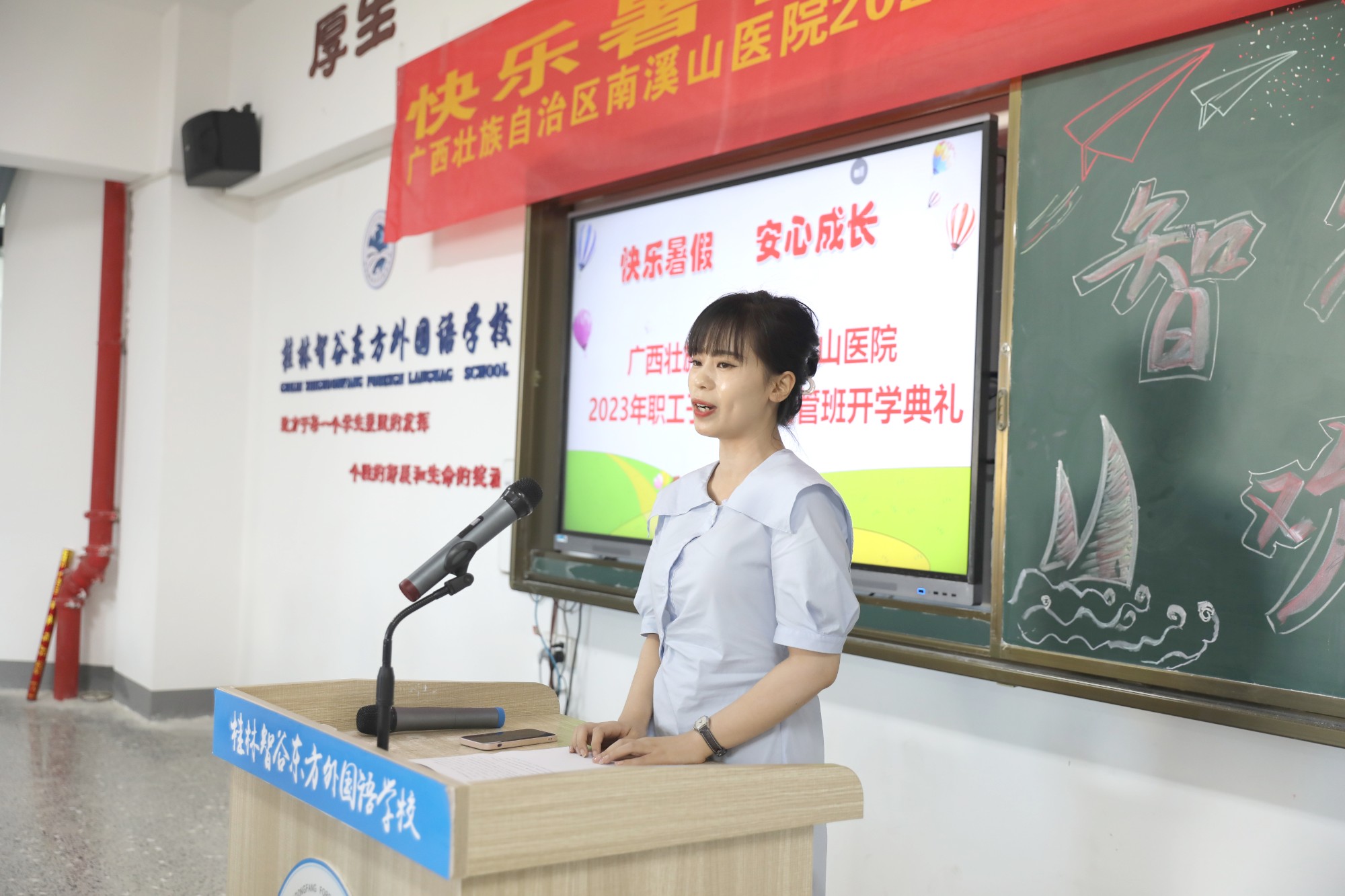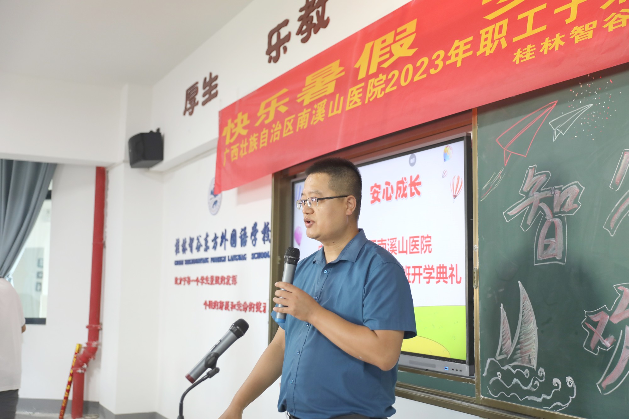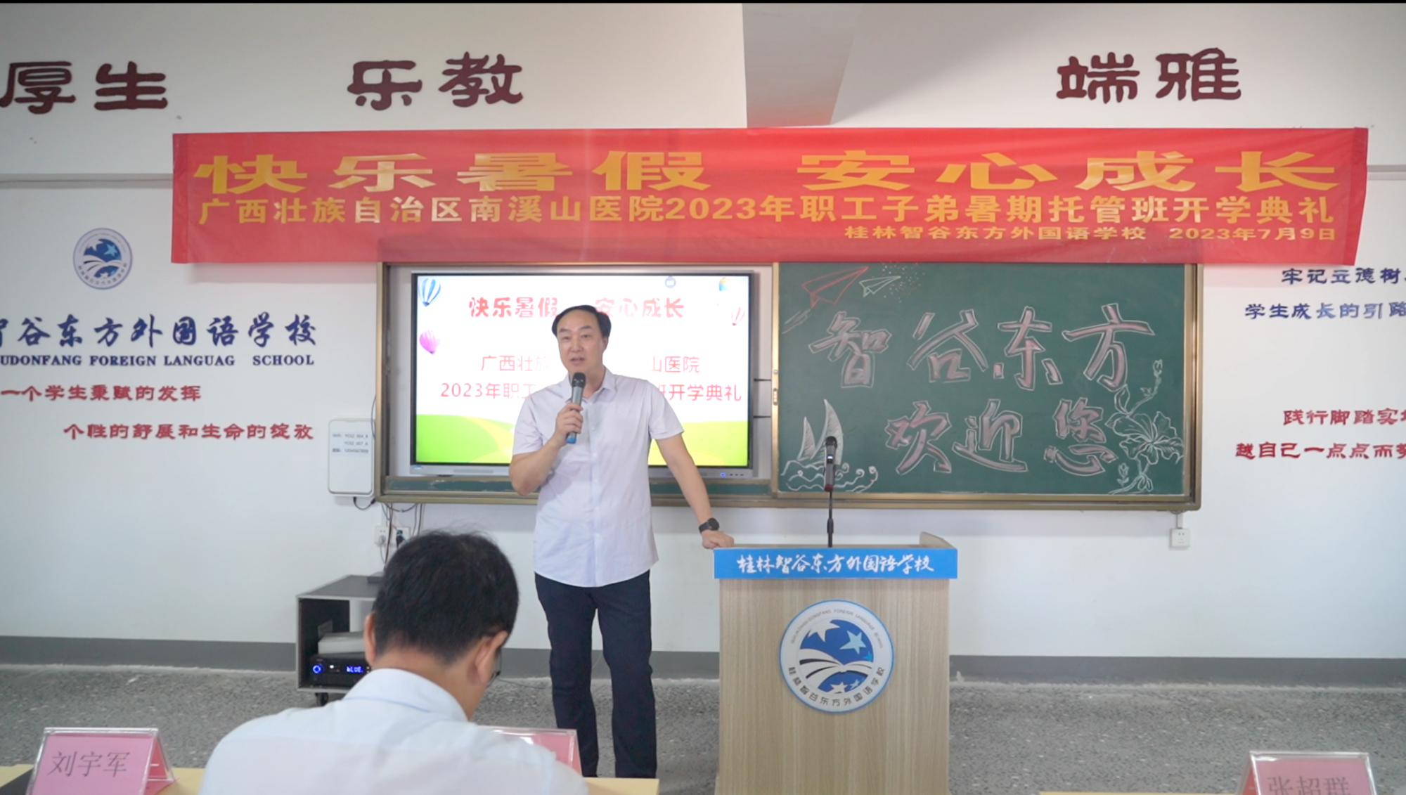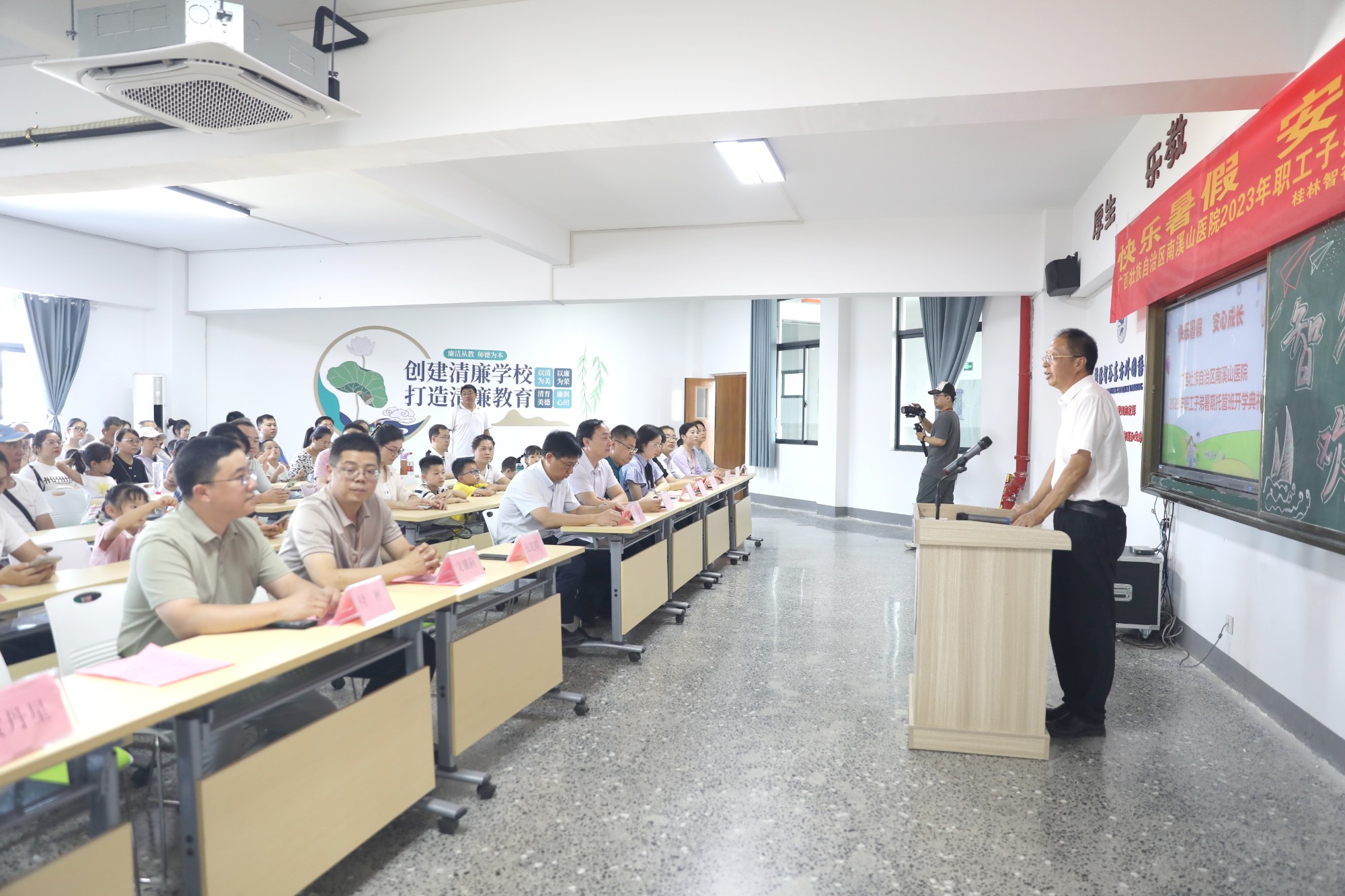 “我宣布:快乐暑假,爱心成长。广西壮族自治区南溪山医院2023年职工子弟暑期托管班正式开班!”7月9日下午,随着刘宇军院长的一声宣布,在桂林东方智谷外国语学校会议室内全场响起热烈掌声。