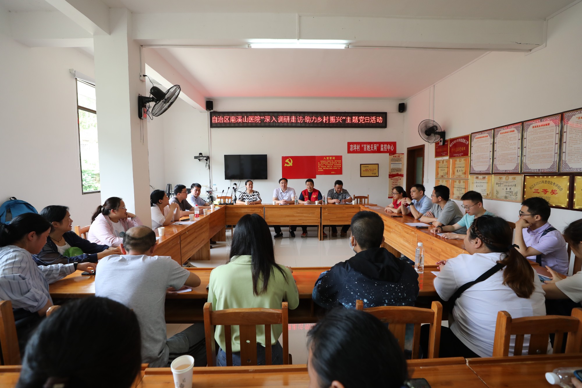当天一早,南溪山医院一行就到达了龙胜县乐江镇凉坪村,在村委会议室召开了发展壮大村集体经济工作三方见面座谈会,与村委、驻村工作组、村民代表就乡村振兴取得的成绩、目前存在的困难点和未来发展规划进行了探讨,并积极开展学习贯彻习近平新时代中国特色社会主义思想主题教育,将主题教育与乡村振兴工作紧密结合,同部署、同推进,努力在巩固脱贫攻坚成果与乡村振兴相衔接中做出成效。