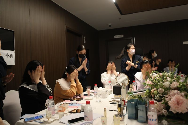 医务人员跟随讲师介绍进行护肤