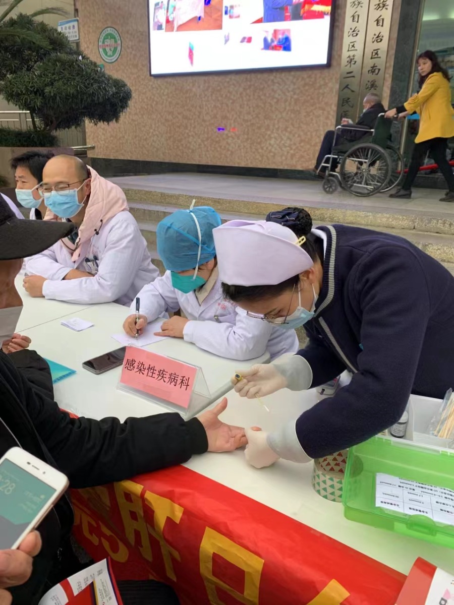活动当天,感染性疾病科、肝胆胰脾外科、肿瘤内科三病区、介入治疗科、超声医学科和检验科等多名专家现场坐诊。义诊现场免费提供测血压、血糖,还有乙肝、丙肝的初筛,以及脂肪肝、肝纤维化和B超的检测等医疗服务。