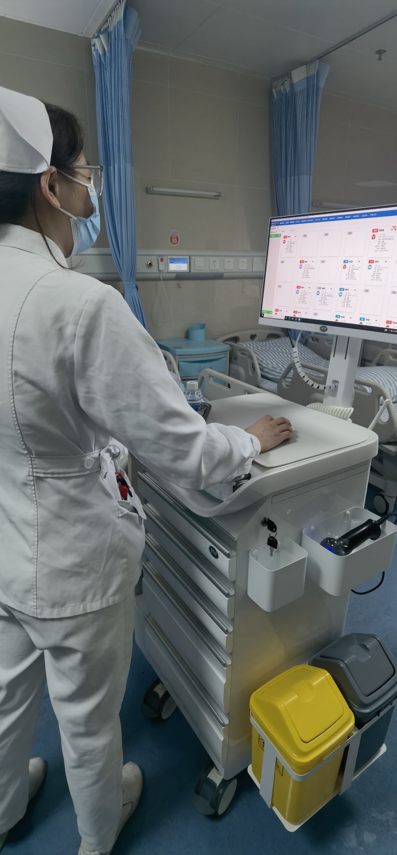 在以往,护理人员在查询或录入信息时易受客观及人为因素影响。如今,使用移动护理推车就可以在病床旁录入患者体温、脉搏、呼吸、血压等信息,并自动生成各种标识曲线,有效避免信息录入失误的同时大大提高工作效率和护理质量,提升了医患沟通的效率,增加了医护人员与病人的沟通交流的时间,对医护人员掌控患者病情,做到精准护理和治疗具有积极促进作用。