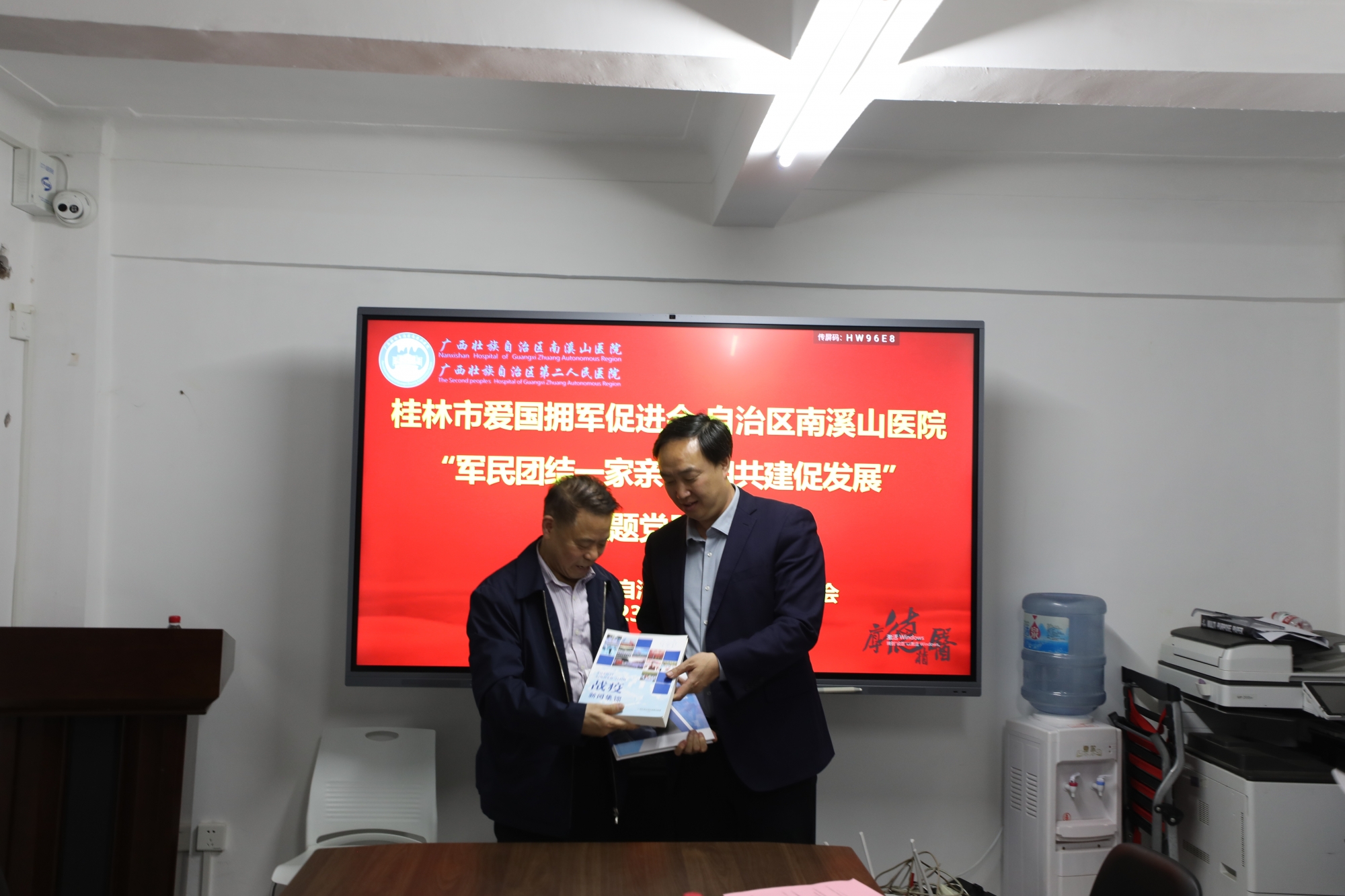 南溪山医院刘宇军院长(右)向桂林爱促会会长欧金平赠送医院文化丛书。李金戈摄