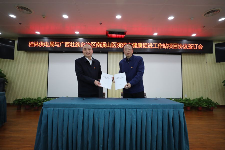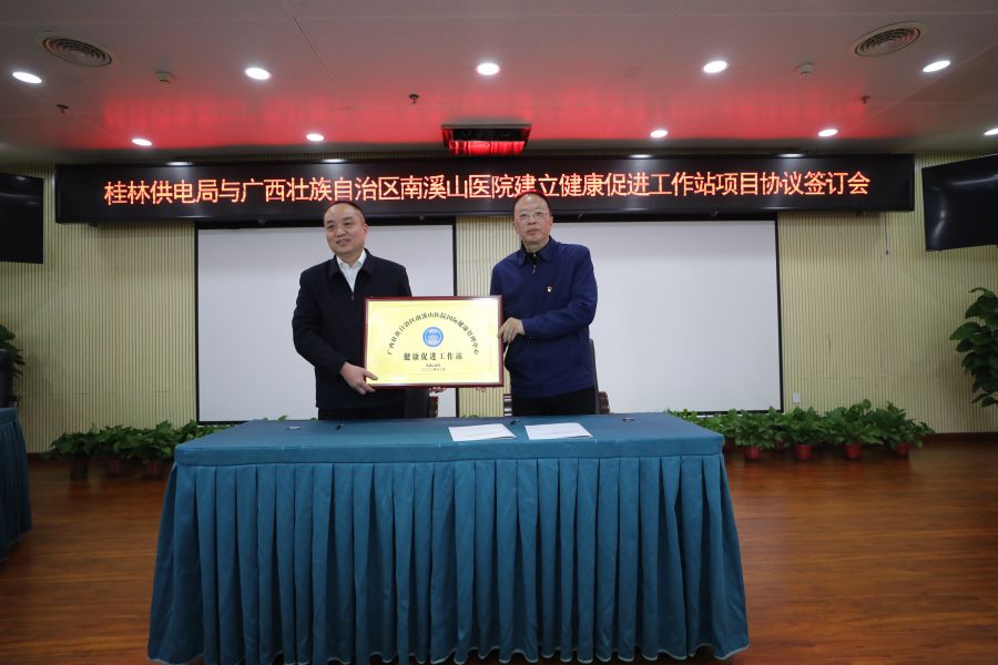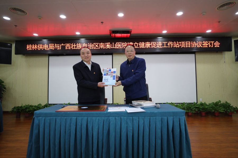启动仪式上,自治区政协委员、广西壮族自治区南溪山医院党委副书记、工会主席张超群与桂林市供电局副局长秦小雄签订建立健康促进工作站项目协议,并向供电局赠送医院相关文化丛书。