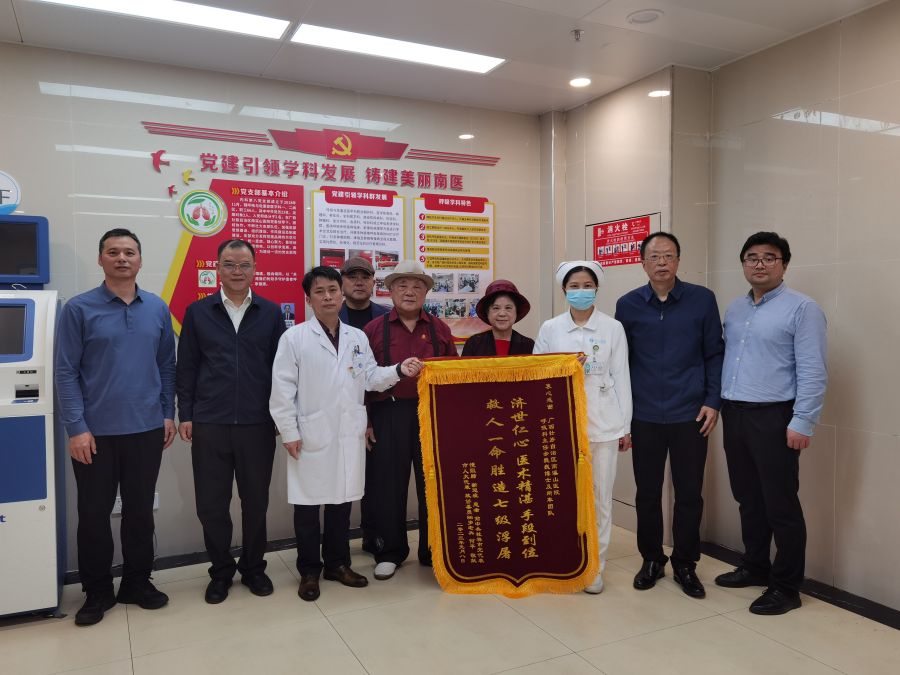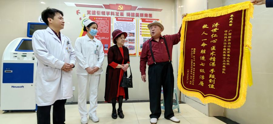 3月22日上午,在桂林市退役军人事务管理局领导的陪同下,桂林86岁老兵何平和家人来到广西壮族自治区南溪山医院呼吸与危重医学科,将一面写有“济世仁心,医术精湛,手段到位,救人一命胜造七级浮屠”的锦旗送到了呼吸科一病区主任佘巍巍博士等医护人员手中,衷心感谢佘巍巍和他的团队在自己病重期间全力抢救,将他从死亡线拉回来的救命之恩。退役军人管理局的有关领导也表达对南溪山医院长期以来坚持开展军民共建、拥军优属,大力支持军队和国防事业的敬意和感谢。