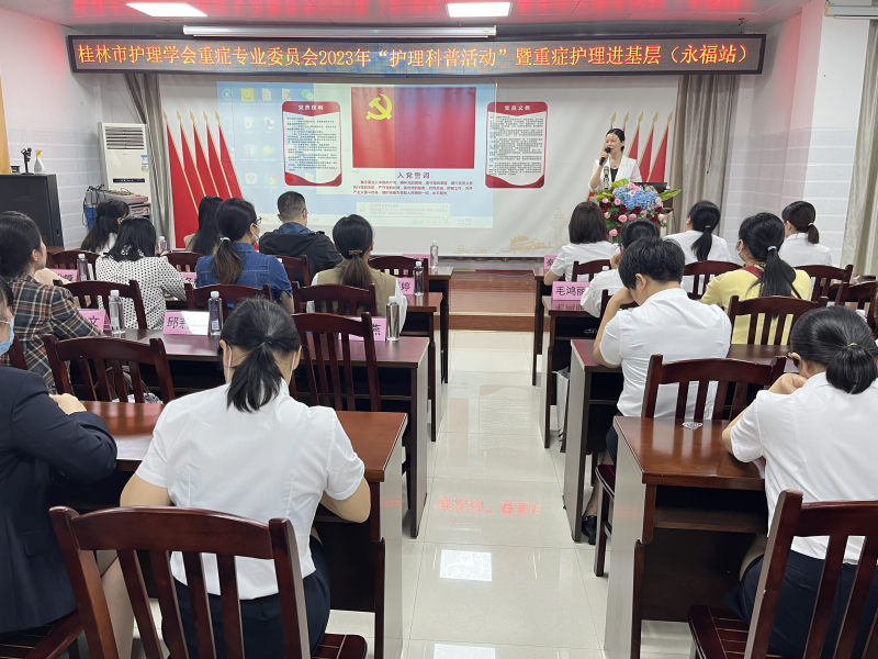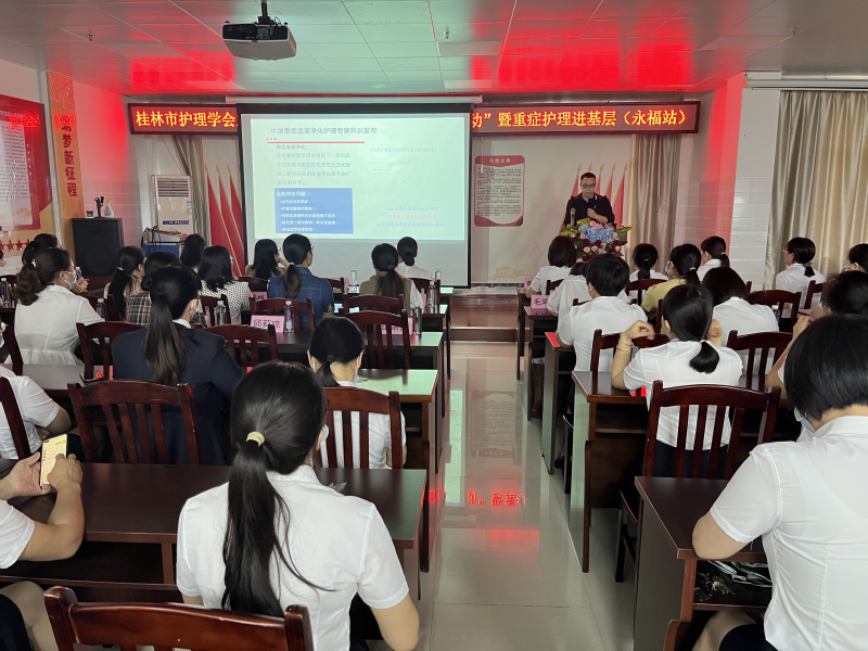 在永福县人民医院,南溪山医院护理部副主任黄锦芳主持“护理科普活动”,她提出,现代医疗技术的不断发展,对临床护理质量也提出了更高要求,为推进医院护理重症专业向高质量发展,必须建立科学的重症医学护理机制,培养具有重症护理能力的人才,普及新知识、新技能。只有切实提高护理人员的学术和专业水平,才能更好地为患者提供安全、优质、高效的护理服务。她强调,本次活动围绕重症护理热点、难点、学术前沿及最新临床思维和救护能力等相关内容进行了学术交流,希望与会人员能够将所学进一步运用到临床,更好的服务于患者。