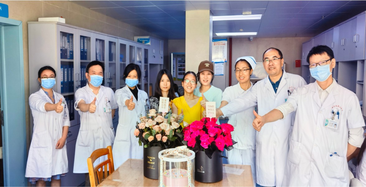 规培医师唐黎、唐荣梅、莫秋霞将满载温暖与感谢的鲜花和蛋糕送到神经内科