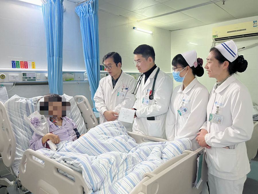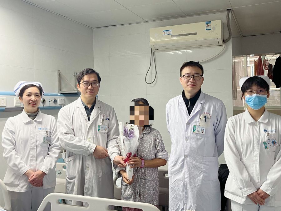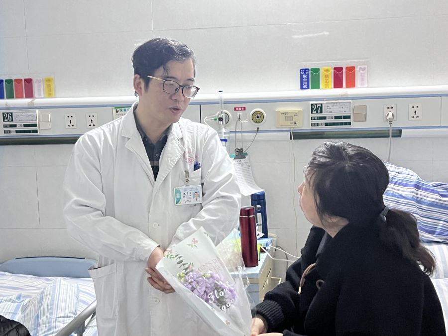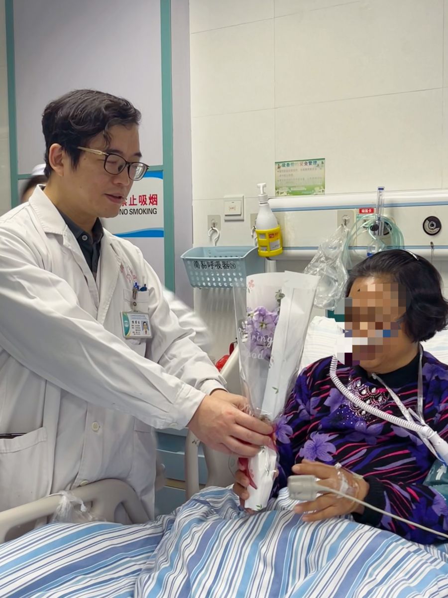 胸外科医护人员为女患者送上祝福的鲜花。