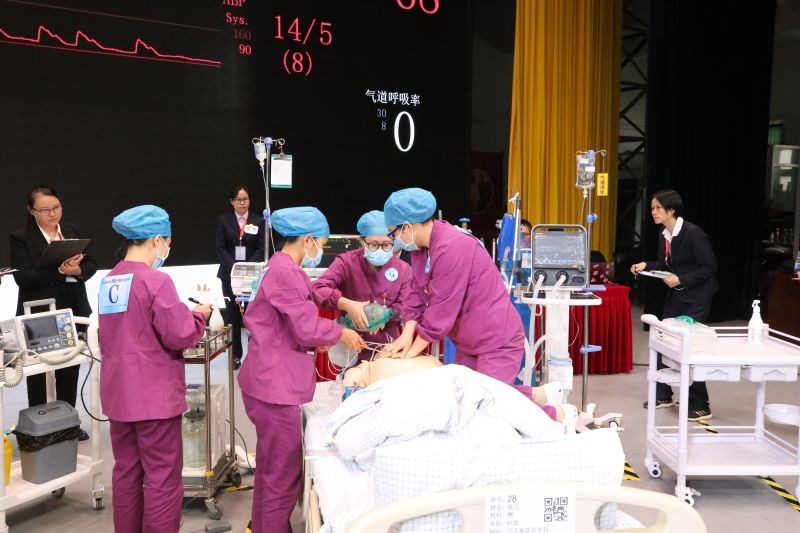 本次竞赛采用理论+模拟技能操作的方式,选手们先通过“护理助手”APP进行线上答题,再现场抽签决定上场顺序及实操题目。在情景模拟现场,每队根据案例设置场景进行评估判断和急救操作,考核内容包括心电监护、心肺复苏、简易呼吸器、电除颤、吸痰、呼吸机使用等多项操作的应用,不仅考核选手临床思维能力及对危重患者应急处置能力,还考验护理团队间的协作与配合。