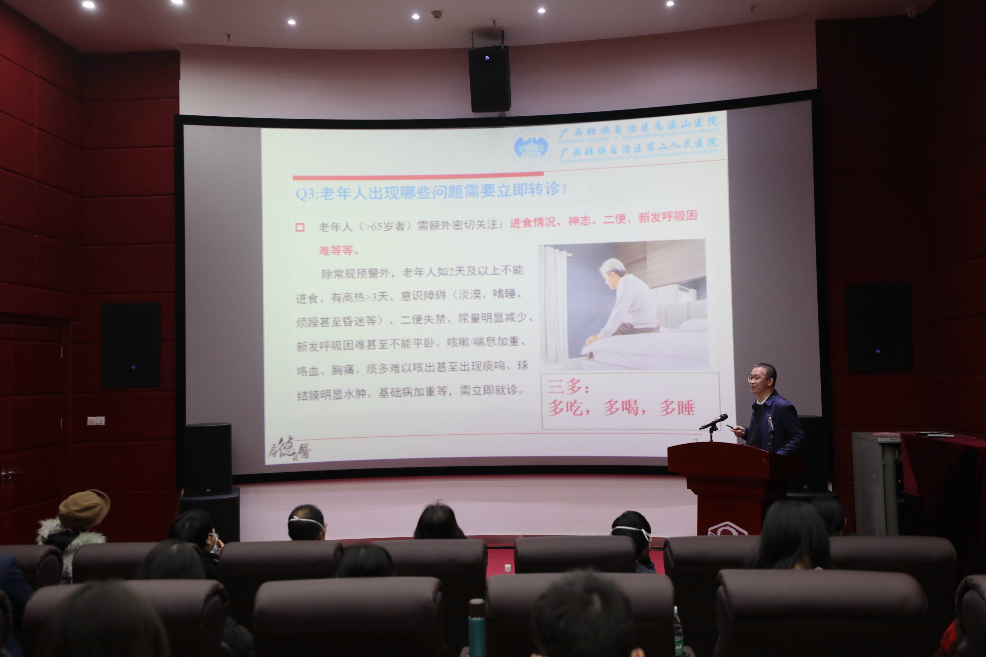 活动中,南溪山医院呼吸与危重症医学科博士侯长春、儿科主任姚臻、老年病科副主任医师周国庆先后为读者和职工普及了新冠病毒感染相关防护知识和认识误区,以及儿童和老人需要注意的防治要点。经过精心策划和筹备,广西桂林图书馆下辖各个县馆和桂林、河池、柳州、贺州、梧州、来宾6个辅导区的40多个公共图书馆中约1200名读者,通过视频线上直播的方式聆听了南溪山医院专家们的精彩讲座。