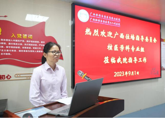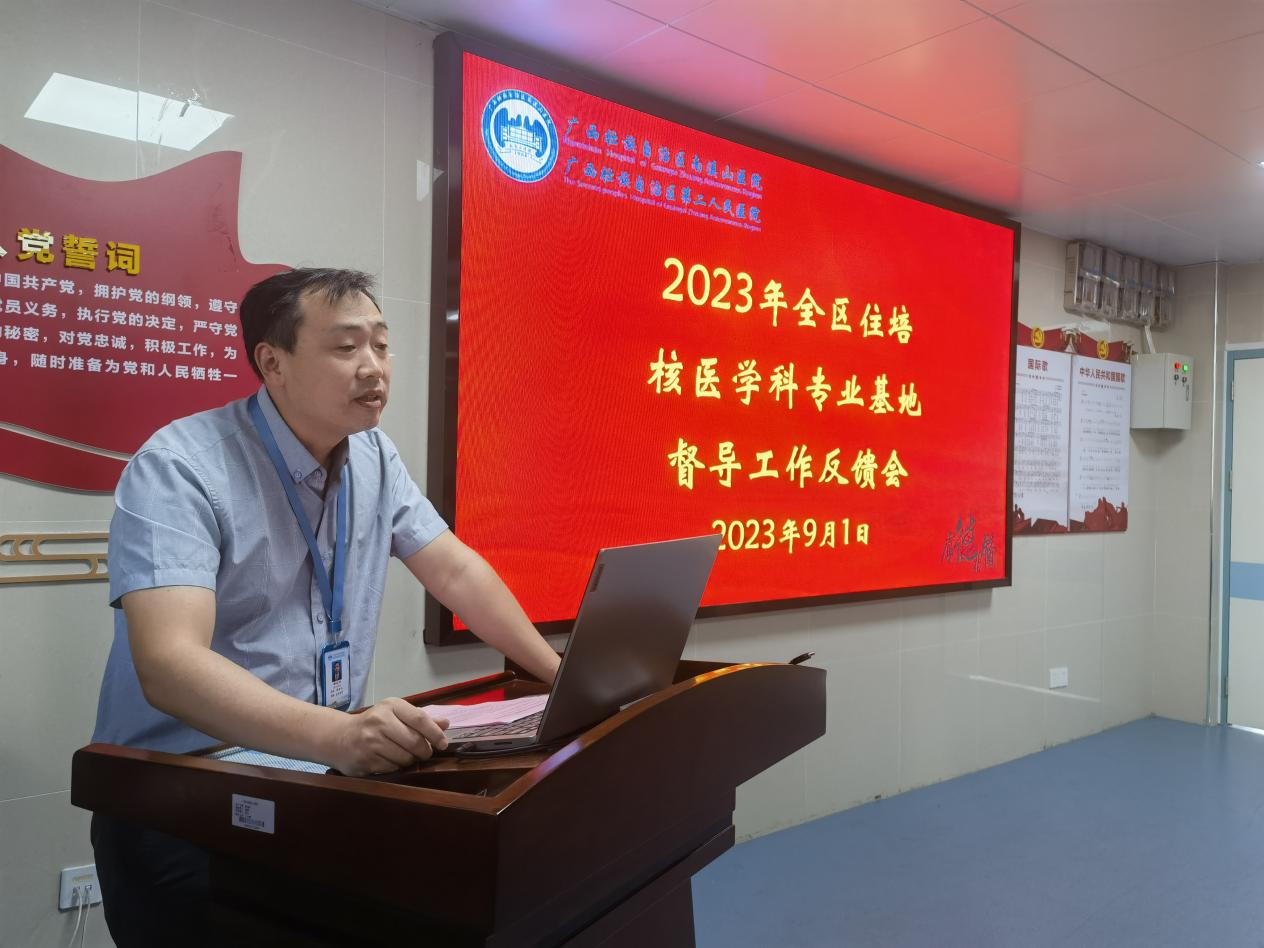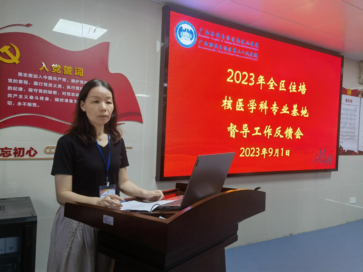 随后,广西区南溪山医院核医学科专业基地教学主任黎川华分别从基地条件、师资条件、过程管理、质量控制、亮点与不足五个方面向督导专家组汇报了核医学科专业基地的情况。