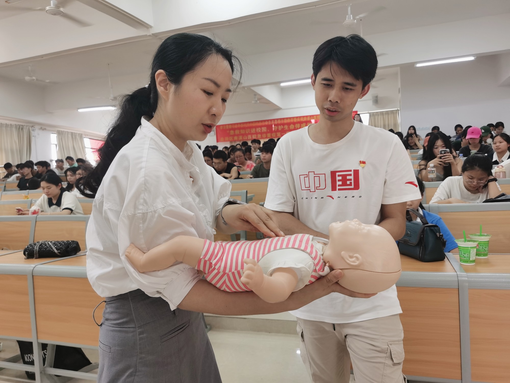 本次培训主要分为理论知识讲解和实践操作两个环节,由南溪山医院综合重症医学科副主任张黎、护士长何思锦分别讲授了《海姆立克急救法》及《成人心肺复苏》等急救健康知识。两名ICU的医护人员通过真人示教和人体模型操作,耐心演示了海姆立克急救法以及心肺复苏操作,使现场百余名学生快速掌握基本要领。在演示完毕后,为了使同学们进一步熟知掌握操作步骤及救助过程中的注意事项,部分学生代表在医护人员的详细指导下进行了实训操作,准确完成了救护动作。