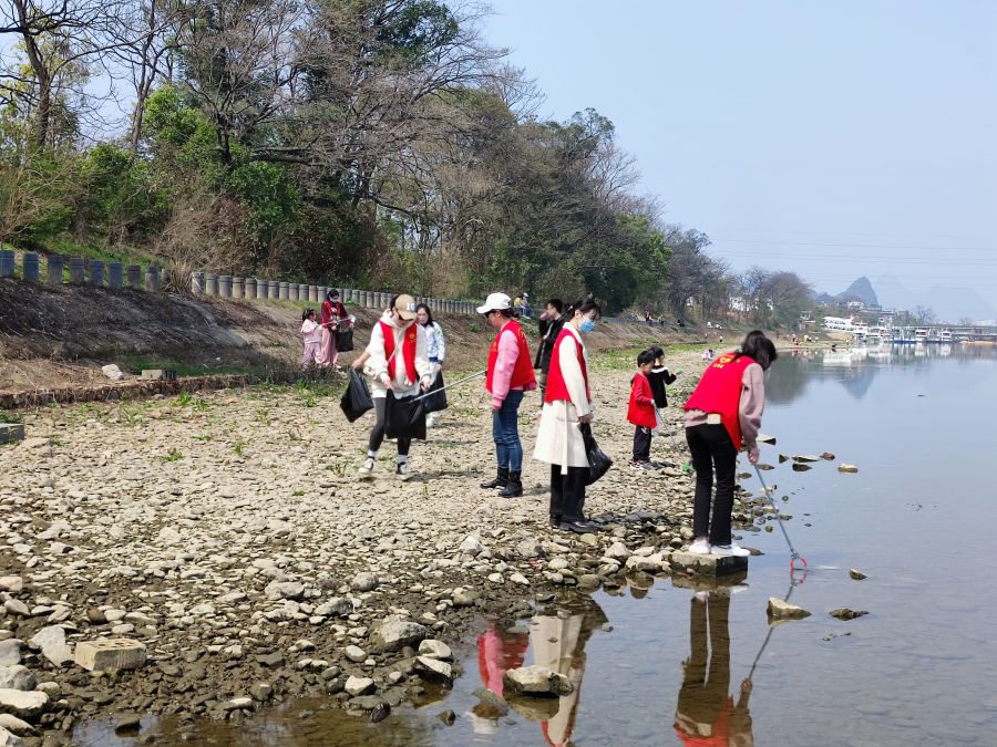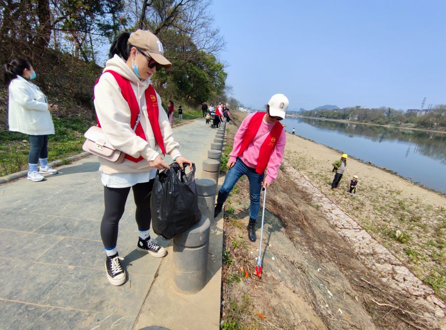 当日,两个党支部的部分党员带领团青年们,前往漓江桂海线段,沿江边一路徒步,一路捡拾江边垃圾。他们仔细拾取沿岸的塑料垃圾和烟头等,保护母亲河,维持“桂岭青青接绣岭,水光倒射马王台”的美丽景色。