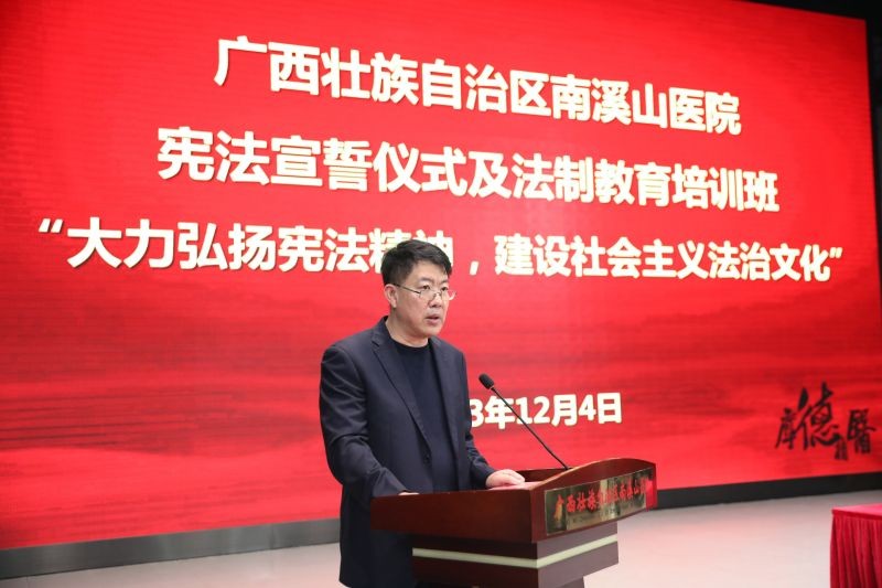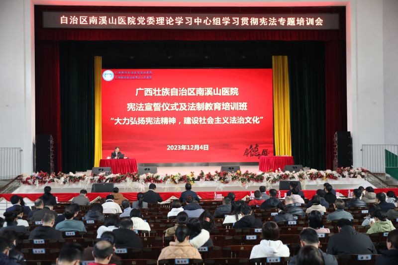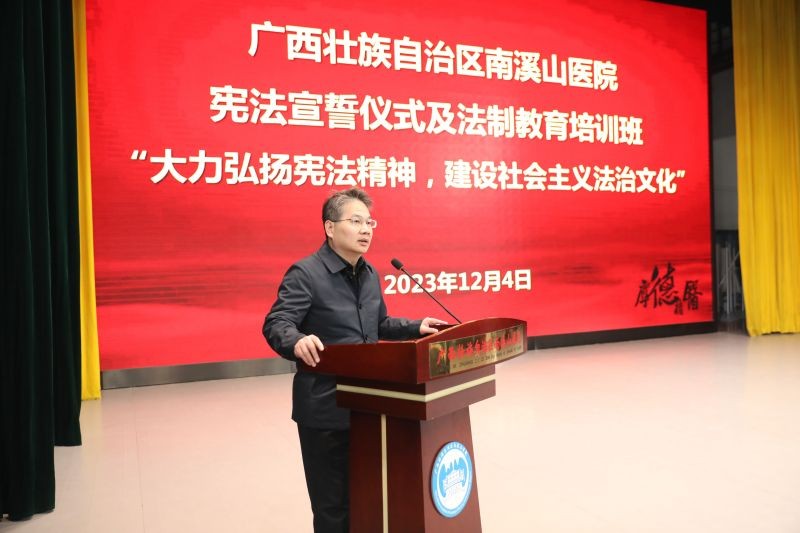 12月4日,广西壮族自治区南溪山医院党委理论学习中心组专题学习《中华人民共和国宪法》,并邀请象山区人民法院党组书记、院长莫刚顺作专题授课,医院党委书记柳宏林作中心组发言,纪委书记喻泽军主持会议。