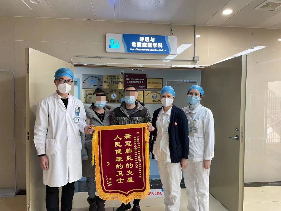 1月15日,甄奶奶的新型冠状病毒基因已呈阴性,CT影像里显示,“白肺”已明显消散。经过南溪山医院呼吸与危重症医学科二病区医护团队的精心救治后,老人的呼吸困难症状明显缓解,咳嗽症状也慢慢消失,精神状态明显改善,1月17日,甄奶奶顺利康复出院了。1月18日,呼吸与危重症医学科一病区的三位老人也达到了出院标准,在同一天内陆续出院回家。离开时,92岁秦爷爷的家属还特地制作了一面锦旗,感谢救治团队多天来的辛勤工作与细心照顾。