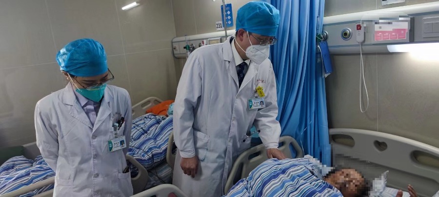 呼吸与危重症医学科二病区主任屈东明正在查看甄奶奶的病情