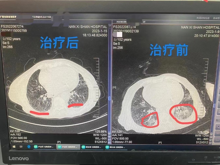 家住桂林市象山区的甄奶奶今年已经102岁,1月9日因“咳嗽、咳痰10天,发热、呼吸困难1天”由其家人送至自治区南溪山医院呼吸与危重症医学科二病区就诊,入院诊断为肺部感染、病毒性肺炎、高血压,相关检查显示,甄奶奶感染新冠病毒、影像学显示有“白肺”现象。