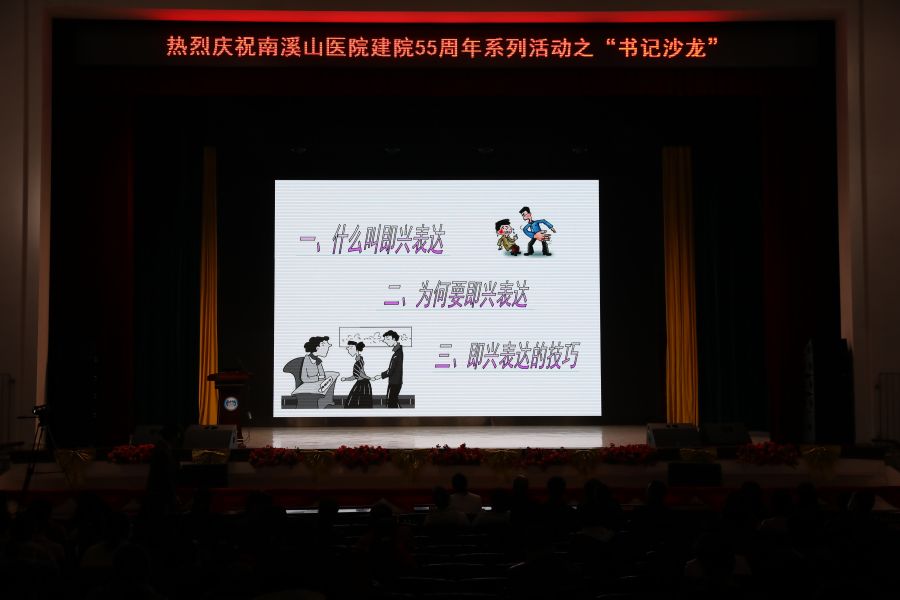 3月1日,庆祝南溪山医院建院55周年系列活动之“书记沙龙”在该院大礼堂如期举办,南溪山医院党委书记戴前富以“侃侃而谈——即兴表达在沟通交流中的运用”为主题,畅谈“说话”的艺术。