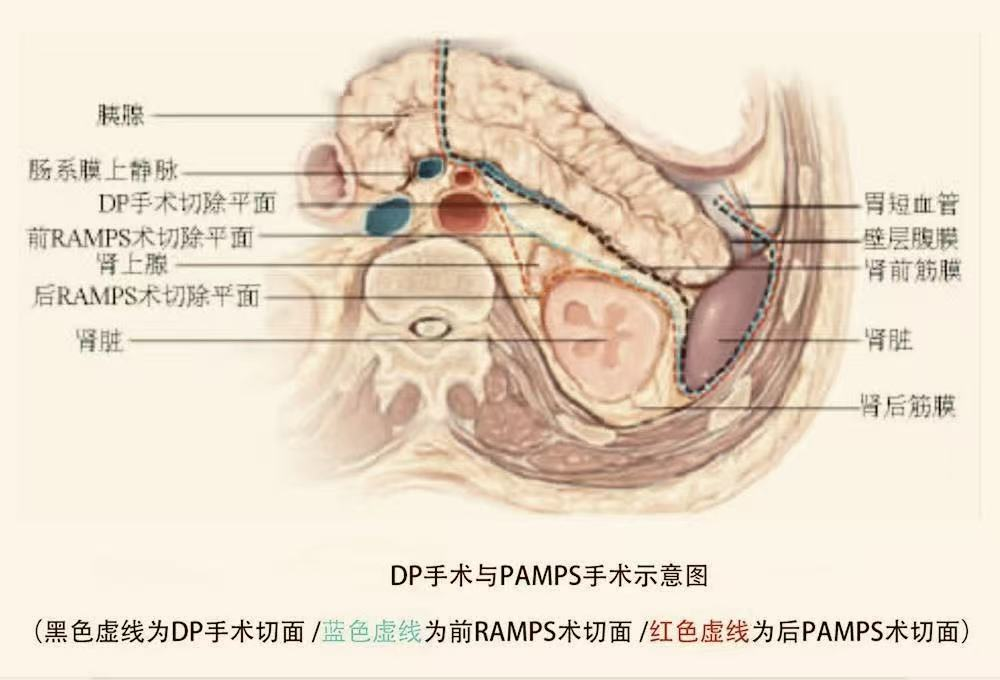 今年79岁的吕奶奶,不久前被上腹胀痛反复困扰,症状逐渐加重后,她在家人陪伴下于9月16日来到南溪山医院消化内科就诊。临床诊断考虑胰体尾癌转入肝胆胰外科。CT检查结果让所有人揪紧了心:胰腺体尾部站位4.5cmx3.7c考虑恶性肿瘤,更棘手的是肿瘤已侵犯脾动静脉。胰体尾癌的传统手术方式是胰体尾部加脾脏切除,解剖层面为胰后包膜和肾前筋膜之间,该患者肿瘤已经侵犯脾动静脉,传统手术容易导致肿瘤残留而无法做到真正的R0切除。L-RAMPS的手术难度要大于传统手术方式,因为它需要更多的后腹膜组织切除、血管裸露和淋巴结清扫,强调更深层面切除,包括肾前筋膜、肾前脂肪囊,甚至左侧肾上腺等,以期提高生存率。