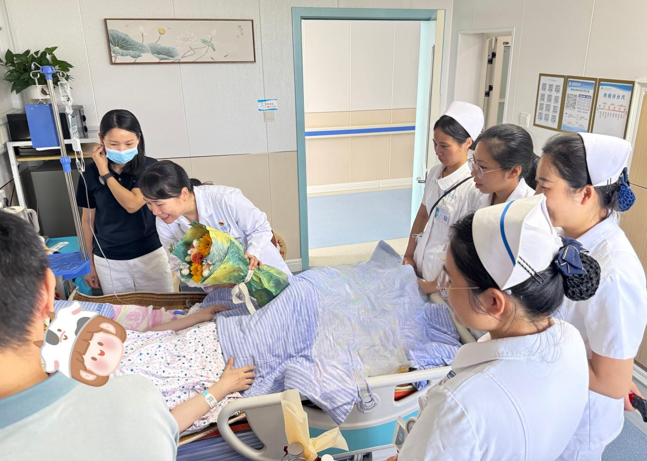 医护人员和社工为兰姐姐送上了精心挑选的礼物——一束鲜花、一个亲手制作并绣有兰姐姐名字的小包和一块玉佩。每一声“生日快乐”,每一句“愿你安康”,都凝聚着大家真切的关怀与鼓励。兰姐姐的家人亦感动不已,哽咽表达了对中心全体人员的感谢:“在这样的时刻,你们还如此用心,让我们感受到了无比的温暖和希望,非常感谢你们所做的一切。”