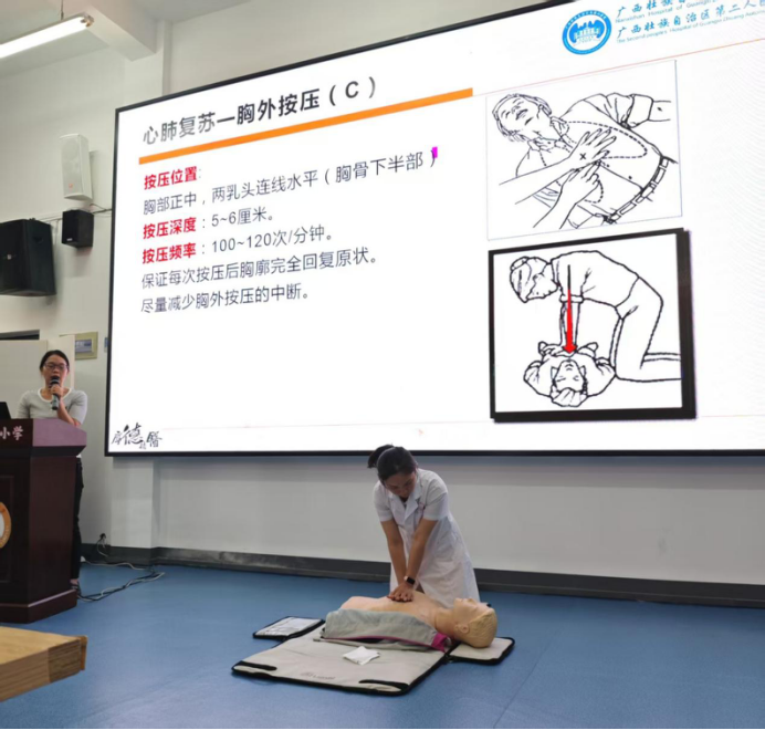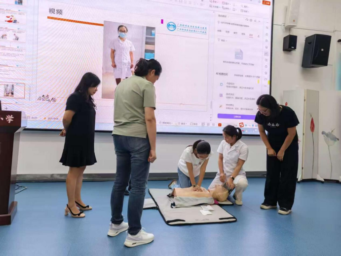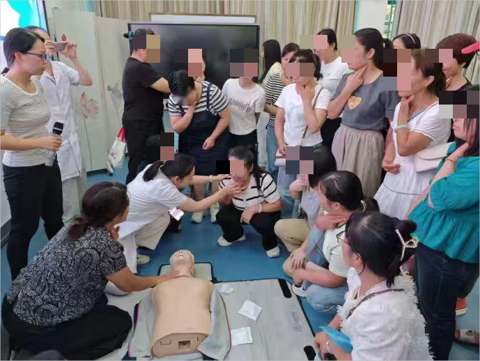 在急救技能培训环节,医院儿科医护团队通过理论讲解与模型实操相结合的方式,生动演示了心肺复苏术和海姆立克急救法的正确操作步骤。参训的家长和教师在医护人员指导下进行了实操练习,掌握了这两项关键急救技能的基本要领。