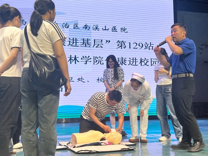 5月9日上午,由桂林市总工会与广西壮族自治区南溪山医院联合主办的“为职工办实事 送医送健康进基层”第129站活动走进桂林学院,为高校师生提供优质的健康服务,普及急救知识,增强健康意识。