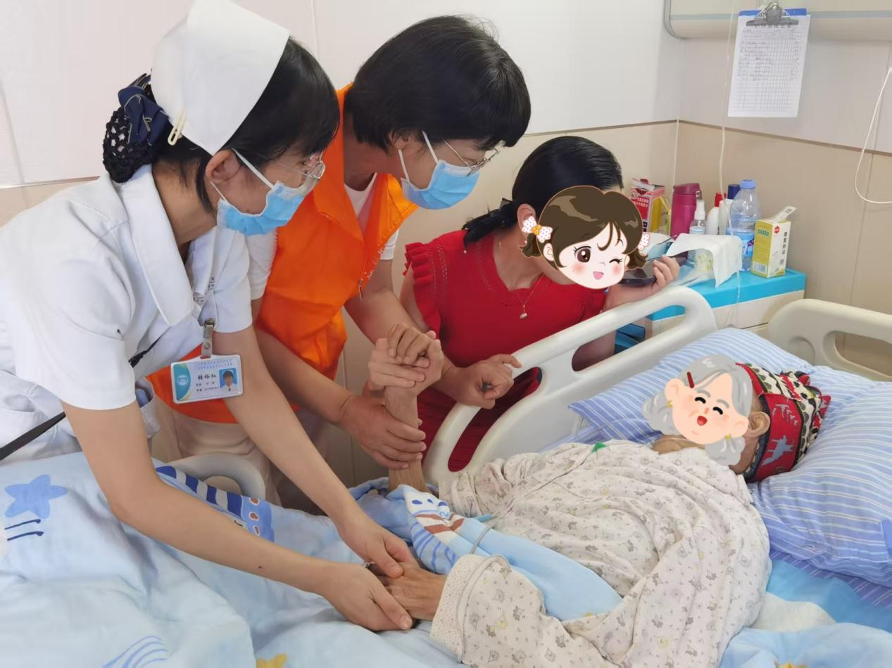 活动中,志愿者们通过音乐疗法、抚触沟通、同频呼吸、祥和注视以及“零极限”心理疏导等多元化方法,为患者营造出安全、宁静的陪伴空间。这些实践不仅有效缓解了患者的身体不适,更轻柔地叩开了他们的心扉,激发了深藏的情感与表达欲望。一位奶奶在分享时热泪盈眶:“太感谢你们了!我老伴已经很久没和我们好好说过话了。今天有你们的陪伴,他不仅开口说话了,还对我跟女儿说了‘我爱你们’。我真的很开心!”这真挚的一幕,生动体现了安宁疗护“全人、全家、全程”的关怀理念。