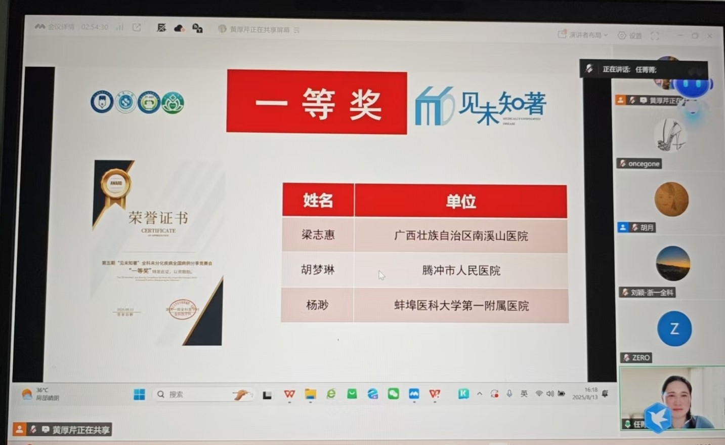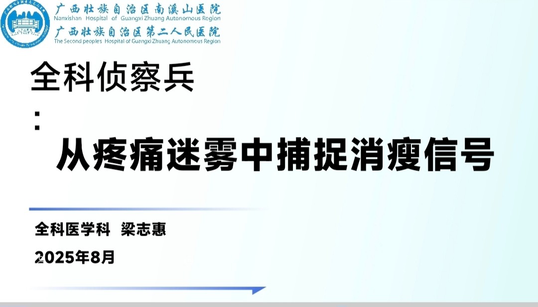 8月13日,由浙江省数理医学学会全科未分化疾病专委会、浙一全科联盟联合举办的第五期“见未知著”全国病例竞赛在杭州圆满落幕。自治区南溪山医院全科团队首次参赛,梁志惠主治医师凭借病例《全科侦察兵:从疼痛迷雾中捕捉消瘦信号》,从全国20家团队中脱颖而出,荣获一等奖。
