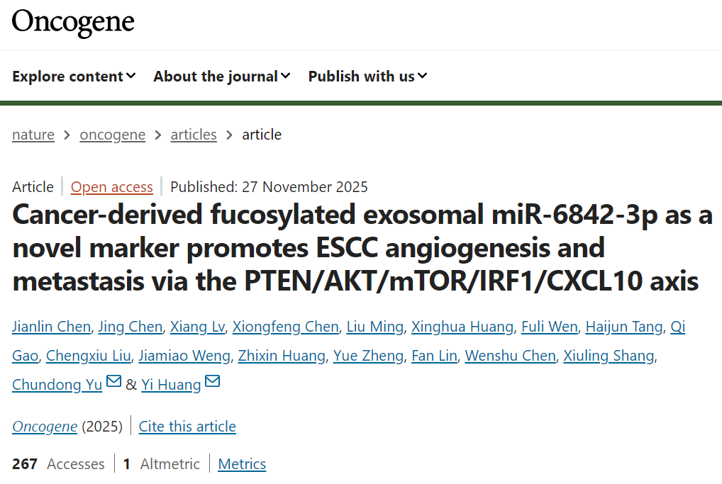 近日,自治区南溪山医院(广西壮族自治区第二人民医院)检验科陈建林检验医师团队与福州大学附属省立医院黄毅教授(导师)、厦门大学俞春东教授团队等合作,在国际权威期刊《Oncogene》(中科院一区TOP,IF=7.3)发表了题为“Cancer-derived fucosylated exosomal miR-6842-3p as a novel marker promotes ESCC angiogenesis and metastasis via the PTEN/AKT/mTOR/IRF1/CXCL10 axis”的最新研究成果。此项成果是南溪山医院医学检验科作为主要研究单位首次在国际老牌期刊上发表高水平研究论文,标志着医院在肿瘤糖基化外泌体领域的基础与临床方面取得新的突破,彰显了其团队的创新实力。