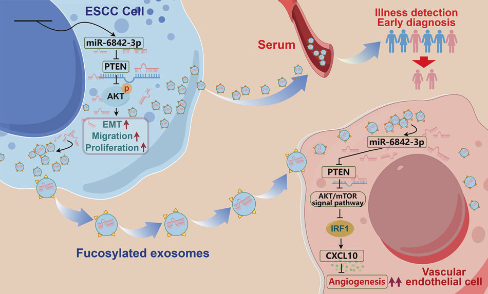 本研究基于团队前期发现,即ESCC患者血清FUC-Exo中miR-6842-3p表达显著上调。初步功能实验表明,外泌体来源的miR-6842-3p可促进ESCC细胞增殖、侵袭和迁移。然而,FUC-Exo递送的miR-6842-3p在肿瘤微环境重塑中的作用、分子机制及临床意义尚未明确。为此,本研究从临床样本分析、体外与动物实验以及分子机制探索三个层面系统开展研究。结果表明,血清FUC-Exo来源的miR-6842-3p是潜在的ESCC早期诊断生物标志物,其高表达提示患者预后不良。进一步研究发现,miR-6842-3p在ESCC中发挥致癌基因功能,可促进肿瘤生长、转移及血管生成。机制上,肿瘤来源的岩藻糖基化外泌体miR-6842-3p被HUVECs摄取后,能下调PTEN表达,进而促进AKT与mTOR磷酸化,并抑制IRF1的表达,最终降低CXCL10水平,驱动肿瘤血管生成。