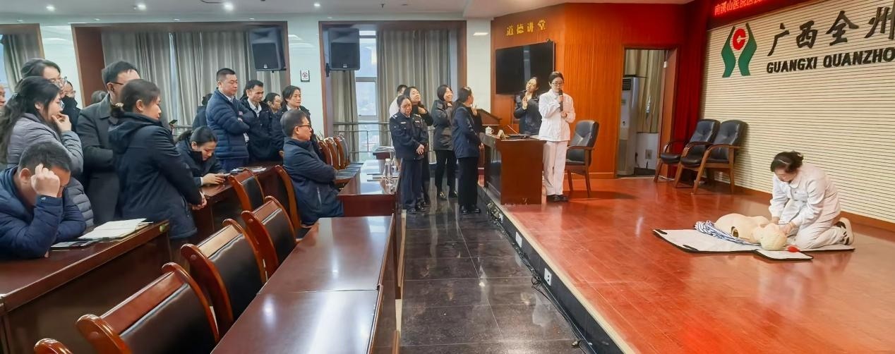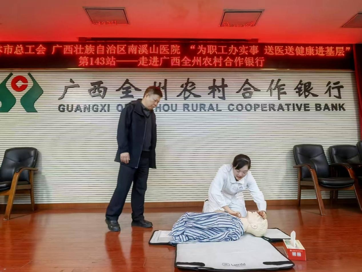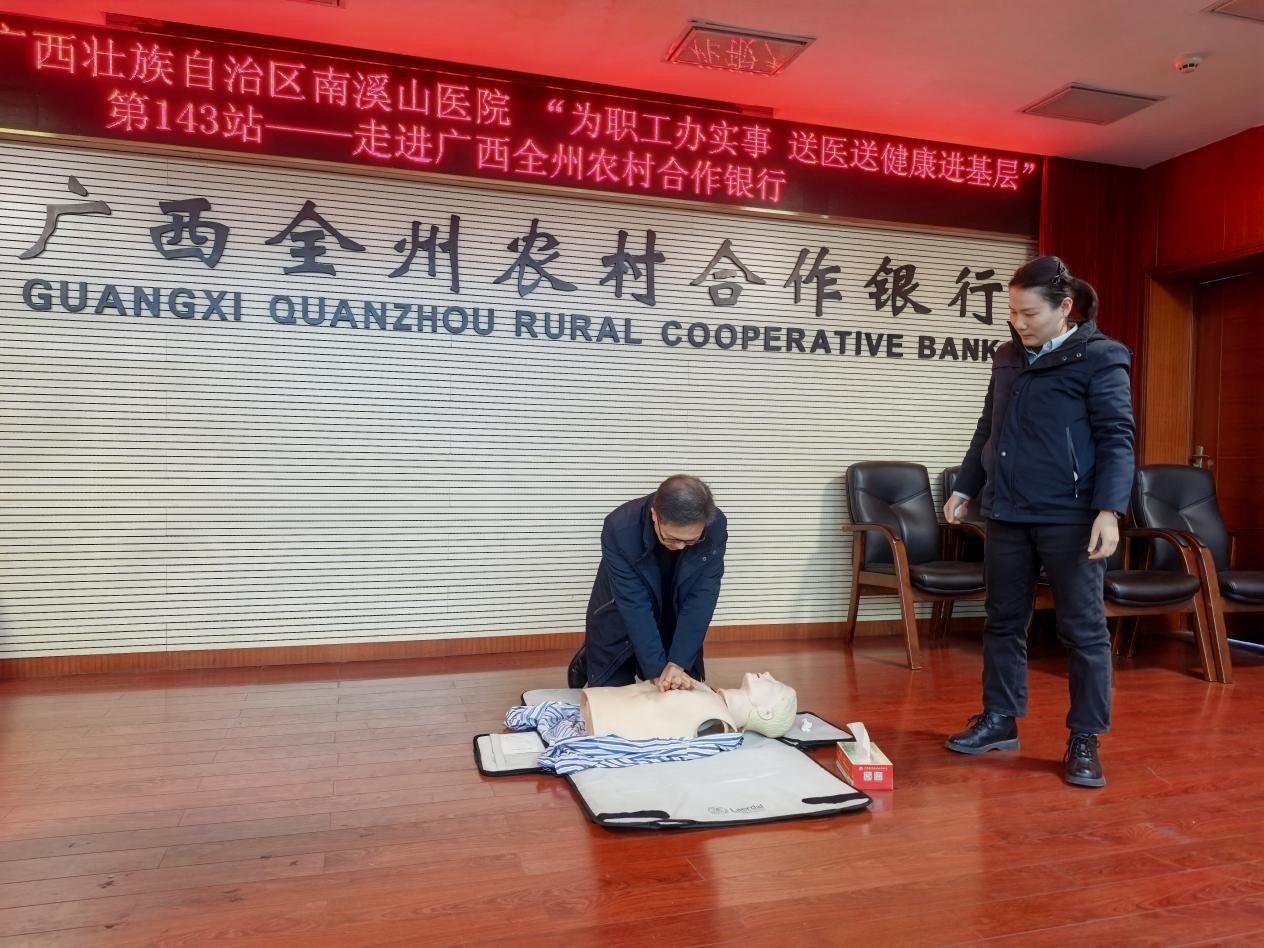 12月18日下午,桂林市总工会与南溪山医院联合举办的“为职工办实事 送医送健康进基层”公益活动走进广西全州农村合作银行。作为该系列活动的第143站,本次活动特别根据广西全州农村合作银行的实际需求与工作场景,强化了急救技能培训模块,旨在为基层职工送去更具针对性、实用性的健康服务,传递新年关怀。全州县总工会党组书记、常务副主席蒋基俊,广西全州农村合作银行罗丹董事长,谭家明纪委书记、监事长出席活动。