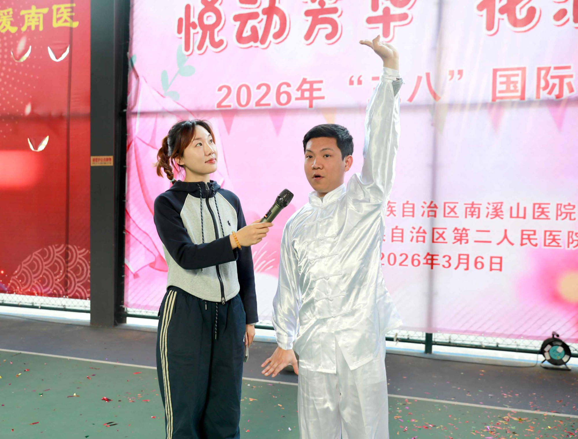 3月6日下午,广西壮族自治区南溪山医院体育活动中心内欢声笑语、暖意融融,“悦动芳华,花满南医”——2026年庆祝“三八”国际妇女节暨职工关爱主题活动温情启幕。活动由医院工会主办,各分工会协办,以“关爱职工、悦动健康”为主线,融合现代健身、中医养生与传统手作,为全院职工送上了一份别开生面的节日礼物。